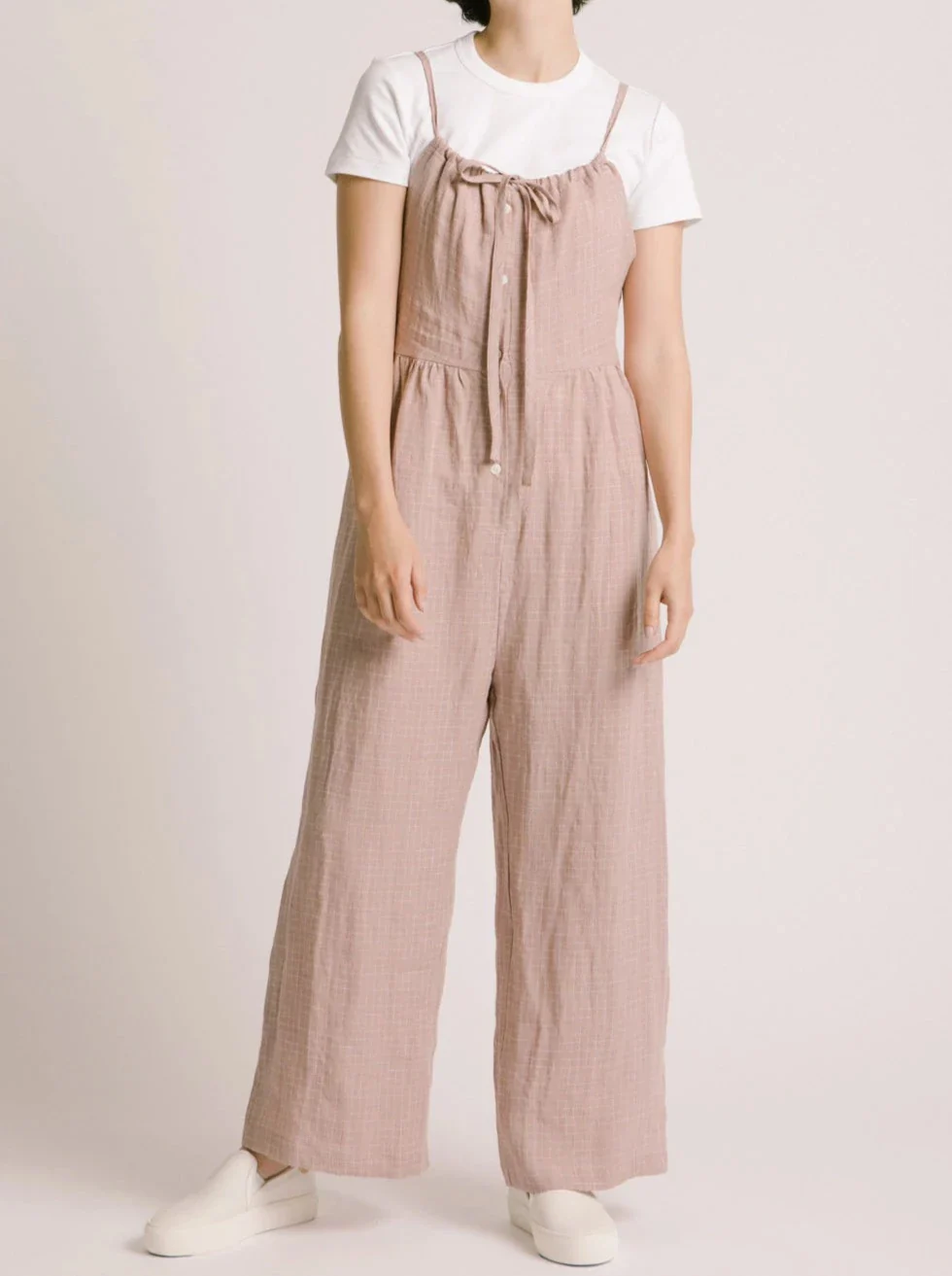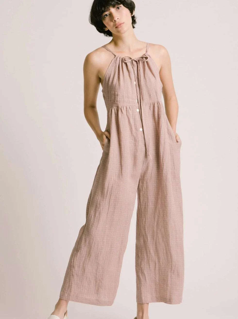 Combinaison à jambes larges avec coutures empire et bouton sur le devant. Il a une coupe ample avec un ajustement au niveau du buste. Les cordons pour serrer fonctionnent comme des sangles et le rend très ajustable et il a des poches dans les coutures. À porter avec un t-shirt ou une brassière de sport. Fabriqué à partir d’un beau lin léger. Super confortable!