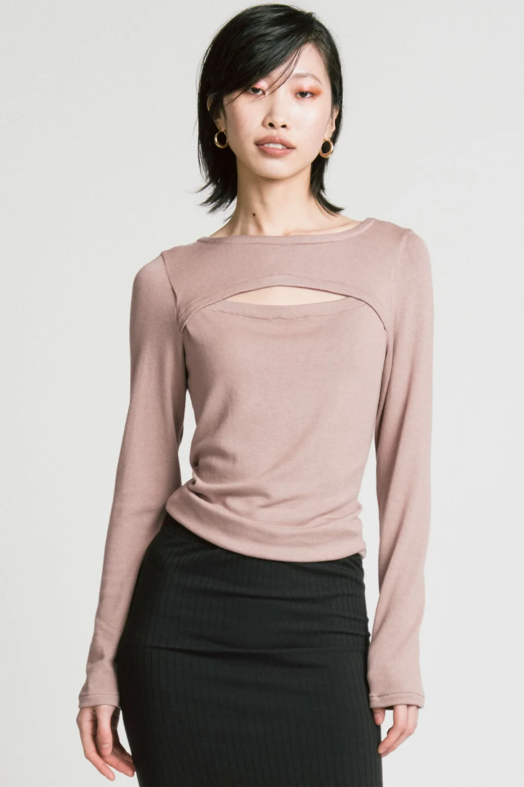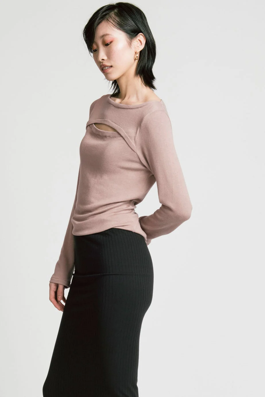 Un pull à manches longues près du corps. Il possède un col ras du cou et une fente pour dévoiler un peu de peau.