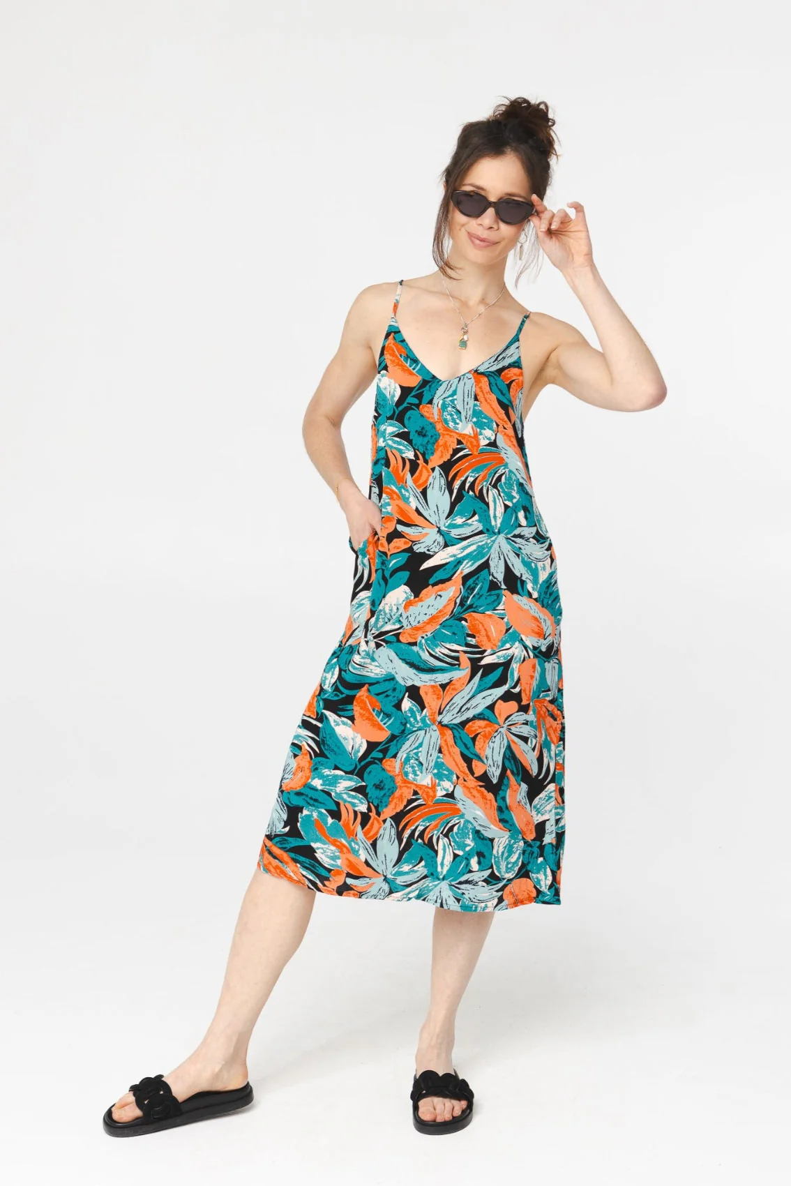 Robe soleil versatile avec poches. Bretelles ajustables. Parfaite pour la plage et les voyages.