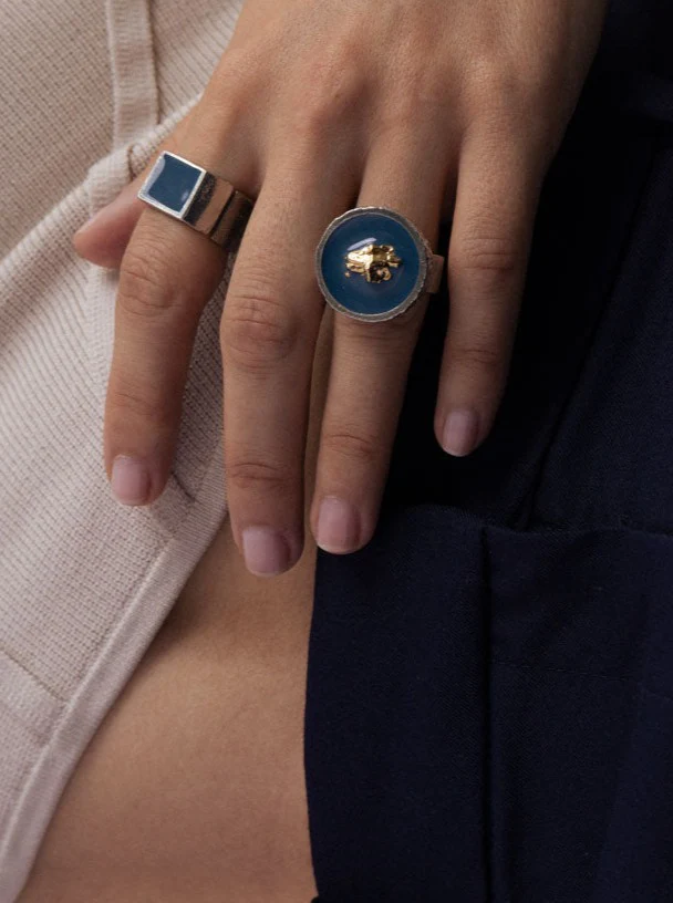 Sublimez votre individualité avec le design original de la Bague Wallis en résine. Une version moderne d’une chevalière médaillon en étain, agrémentée d’une résine colorée et d’une pierre d’étain centrale.