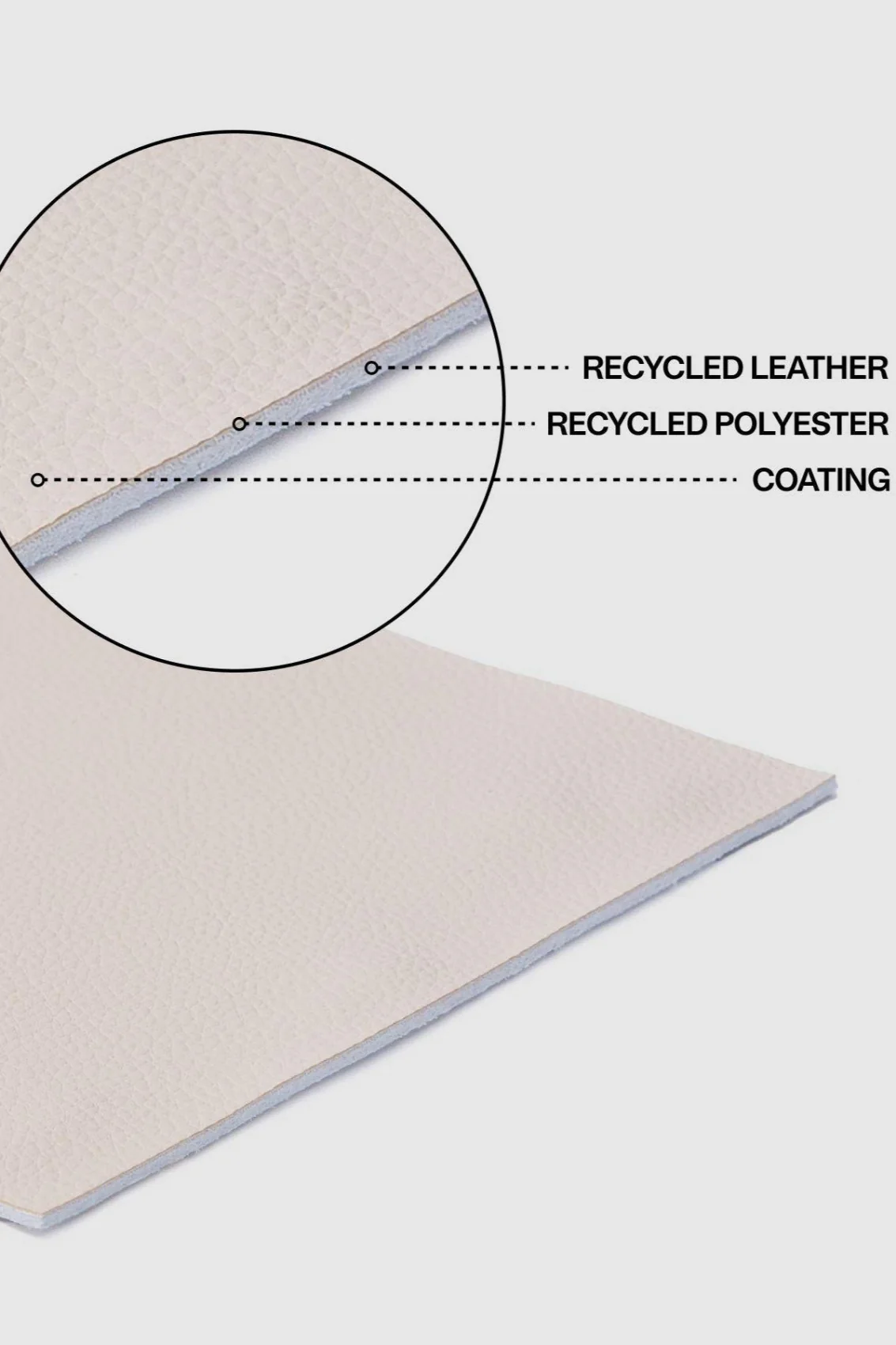 - Cuir recyclé composé à 70 % de fibres de cuir recyclées pré-consommation, à 17 % de polyester recyclé post-consommation et à 13 % de polyester