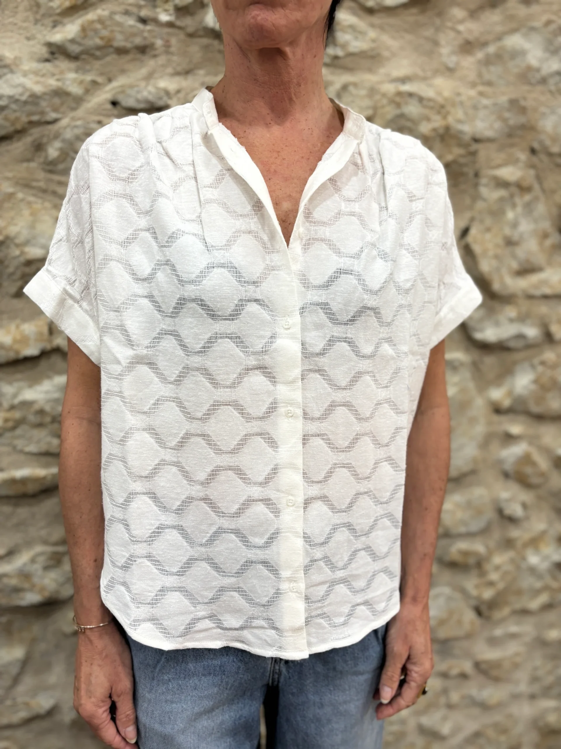 Matières : Jacquard tissé en coton, lin et viscose Coupe : Coupe droite, large et fluide Forme du col : Col maoLongueur des manches : Manches courtes avec froncesCouleurs / Motifs : Blanc Notre modèle porte une taille S et mesure 165 cm. Nom du modèle : LOUISON CARIOCAMarque : SACRÉCOEUR Conseils d’entretien : Lavage […]