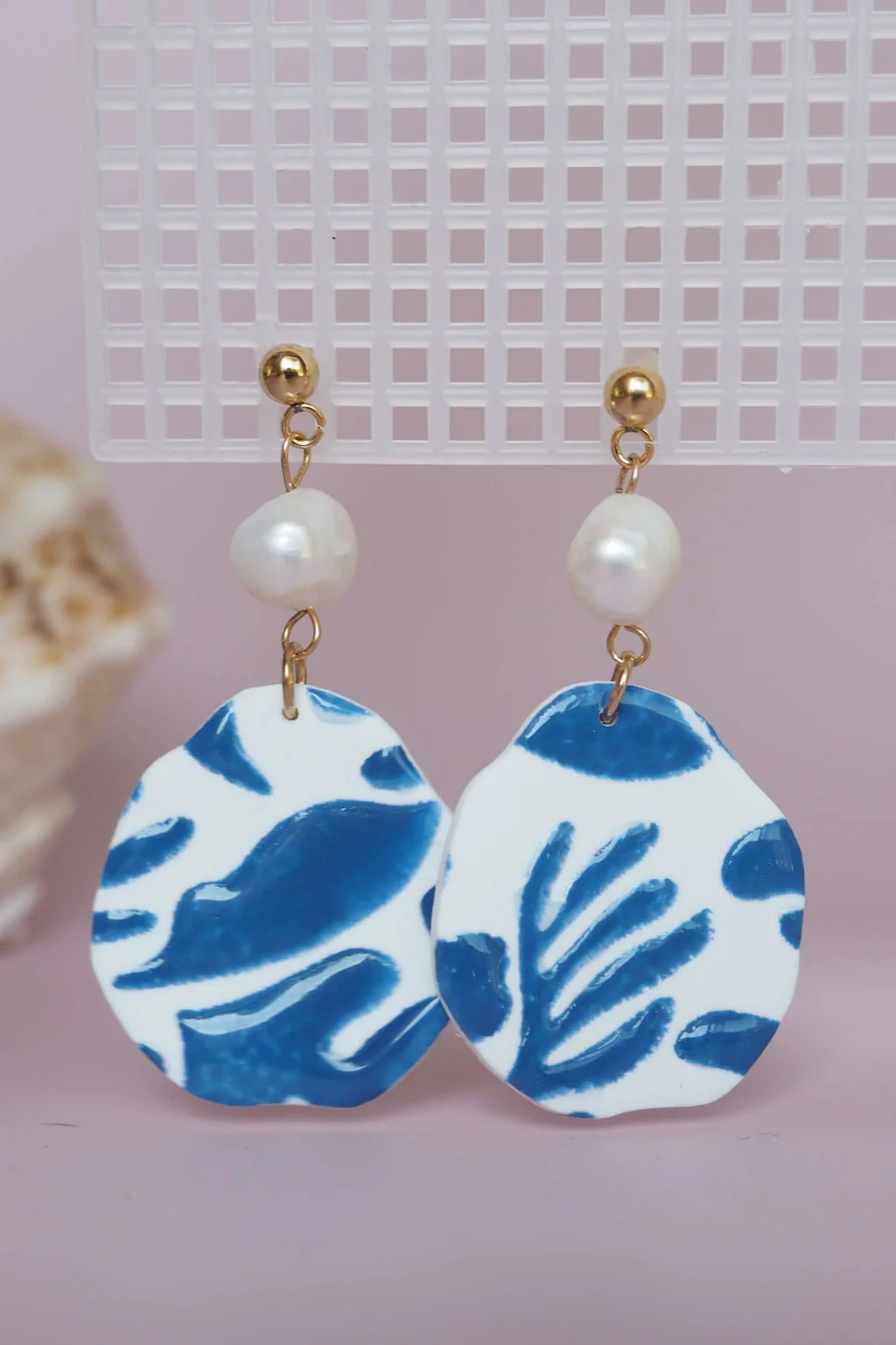 Boucles d’oreilles en argile polymère fabriquées à la main sur une monture en acier inoxydable respectueuse des oreilles sensibles.