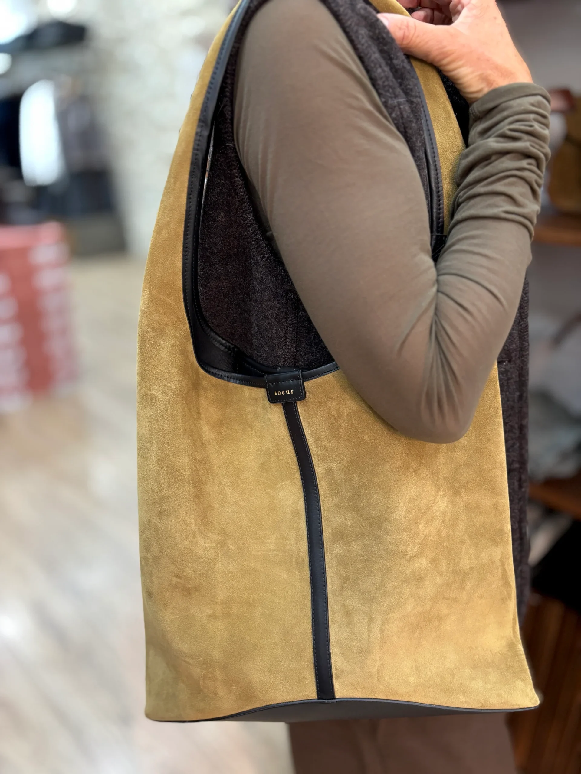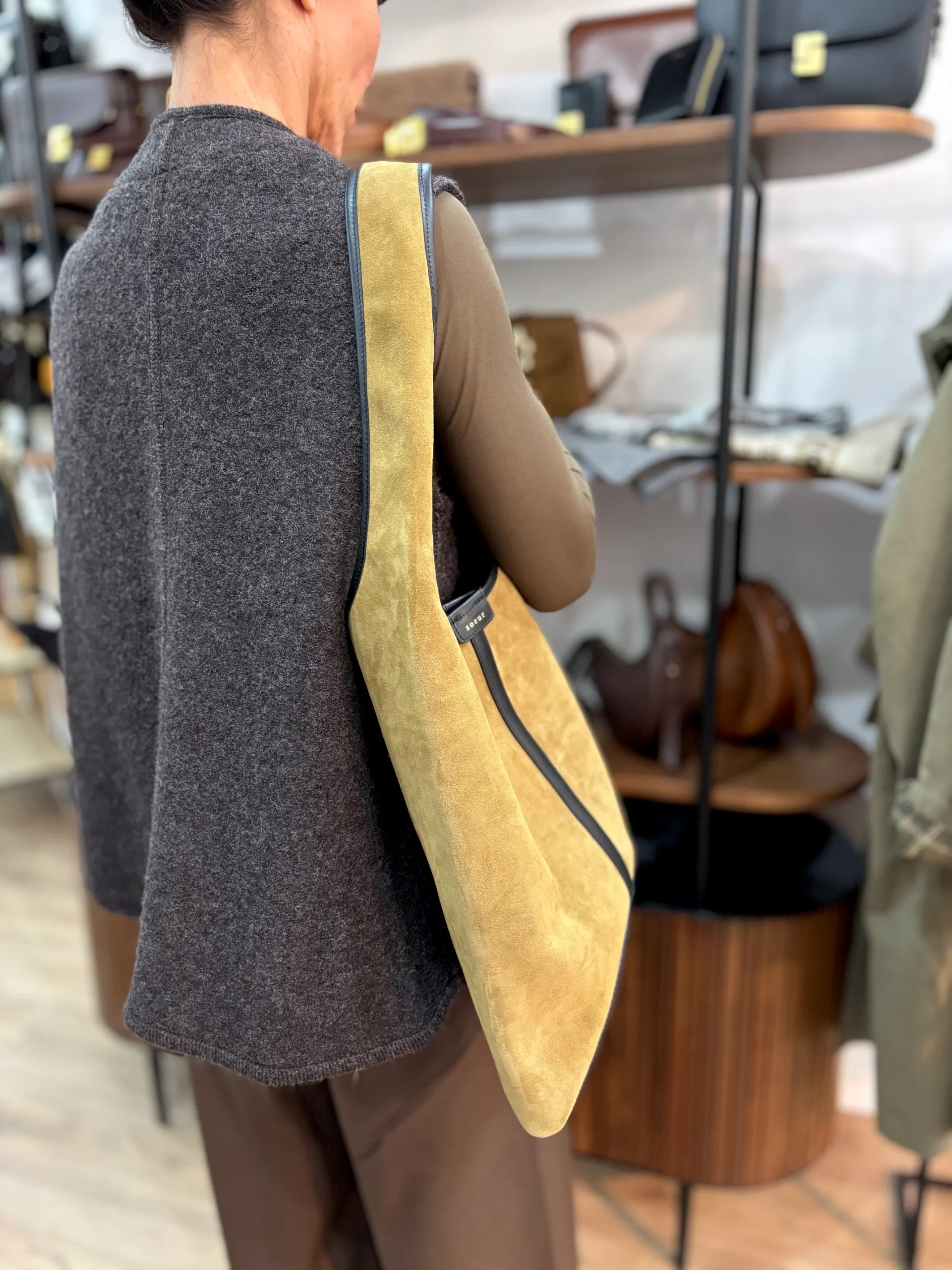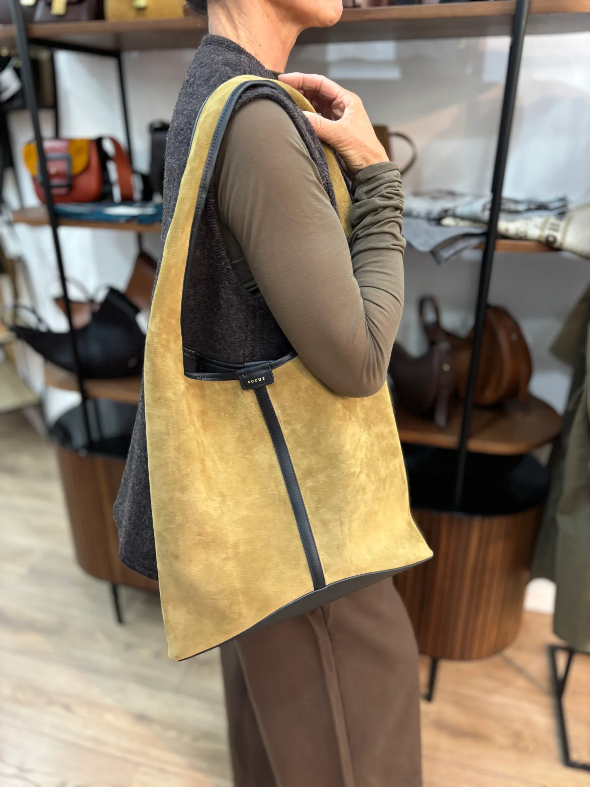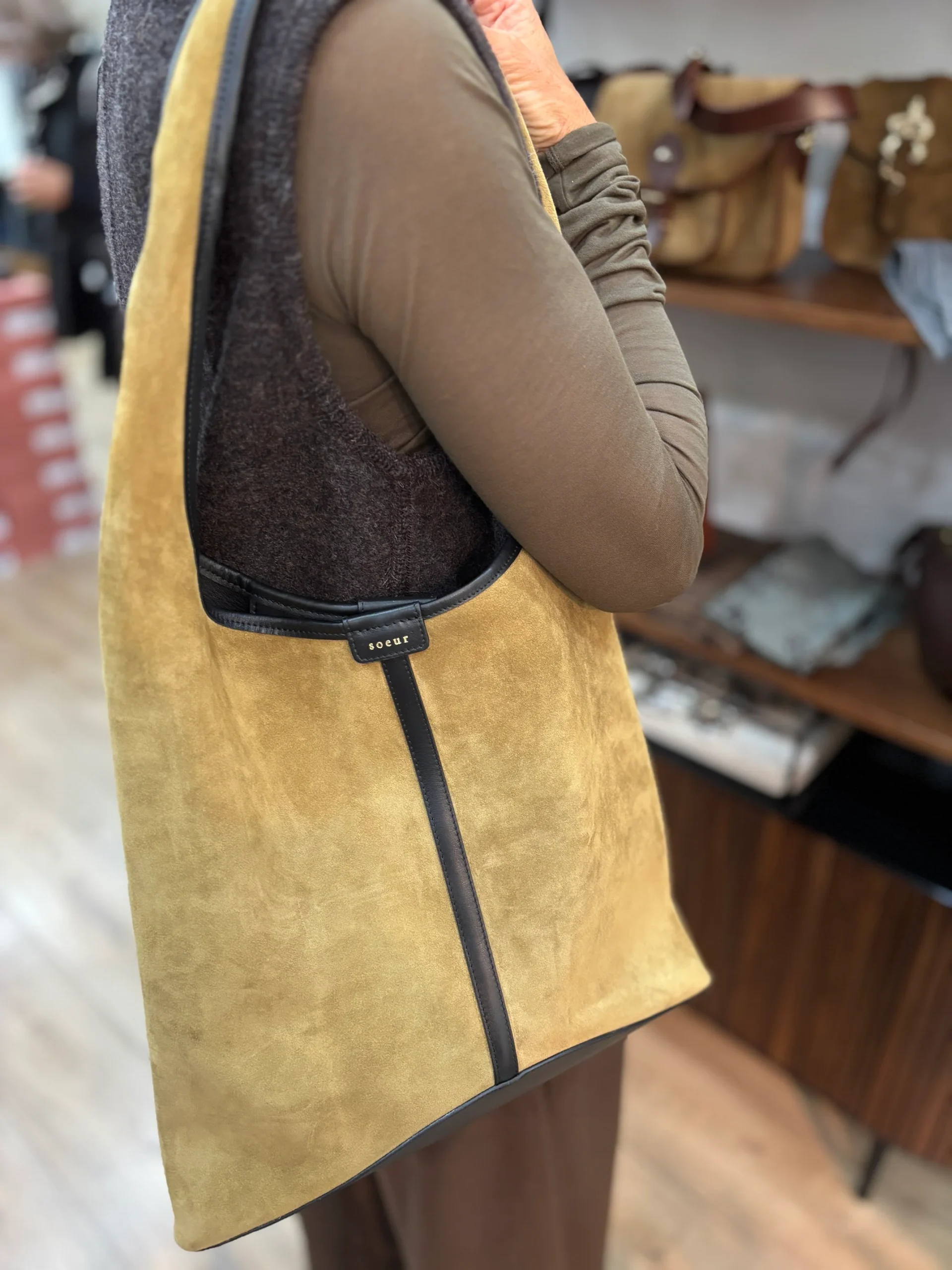 Matières extérieures : Croute de cuir et cuir lisse (cuir de vachette)Doublure : Cuir lisse (cuir d’agneau)Compartiments : Un grand compartiment avec un poche plaquéeAnses / Bandoulières : Une anse pour le porter à l’épauleMotif / Couleur : Bronze et noirDimensions : 36 x 37.5 x 16 cm Nom du modèle : DELICEMarque : SOEUR […]