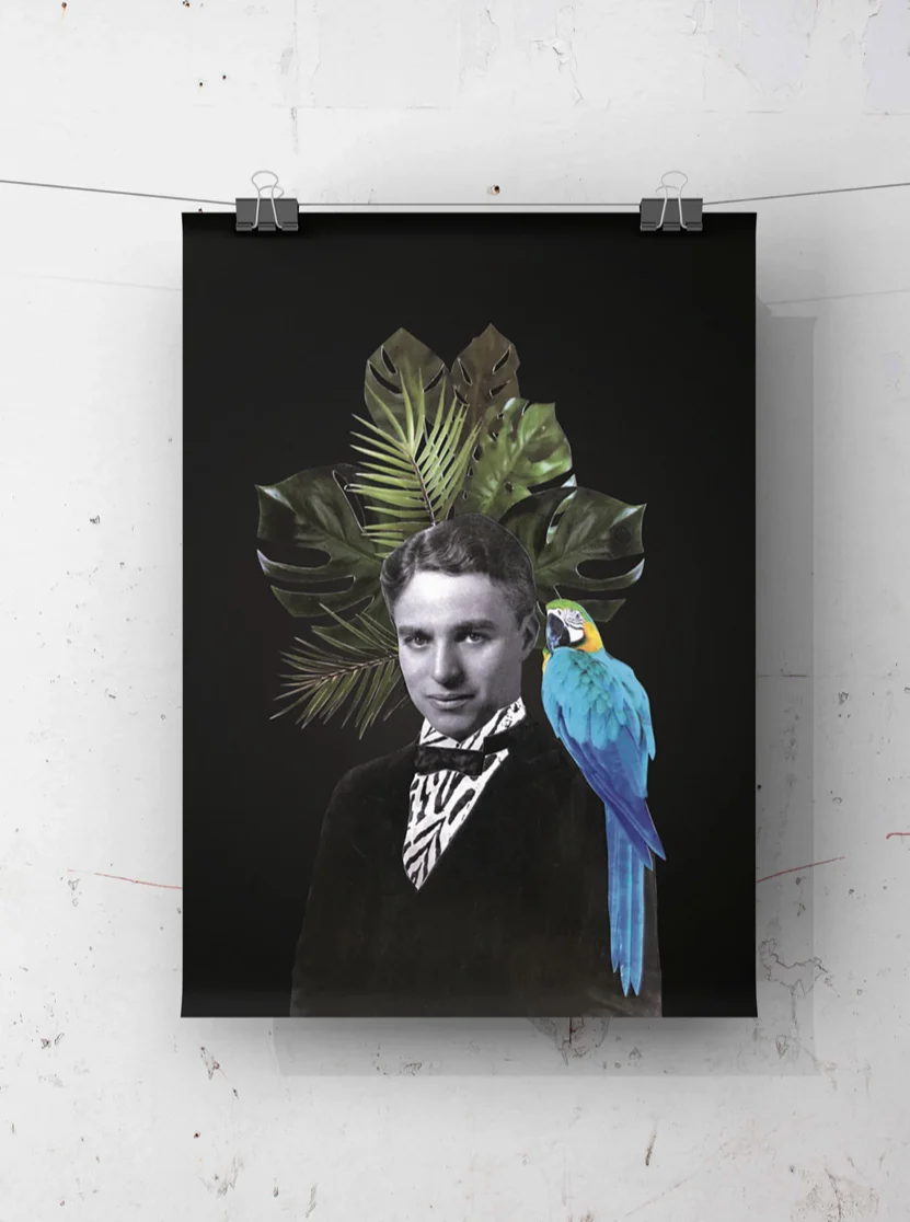 Création locale, faite avec amour et talent au Québec. Affiche représentant Charlie Chaplin, avec un perroquet bleu sur l’épaule. Détails: Dimensions: 8×10 imprimé au Québec sur du carton de qualité, fini velours