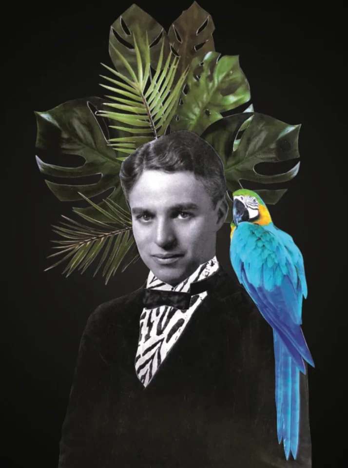 Affiche représentant Charlie Chaplin, avec un perroquet bleu sur l’épaule.