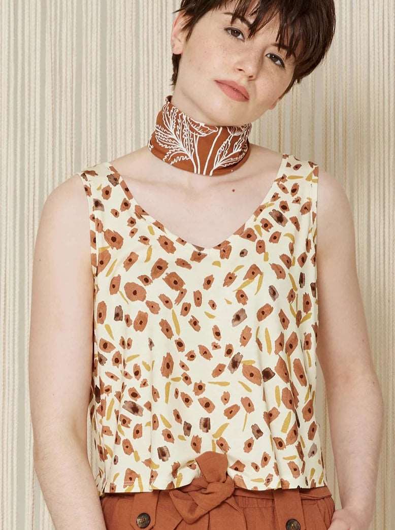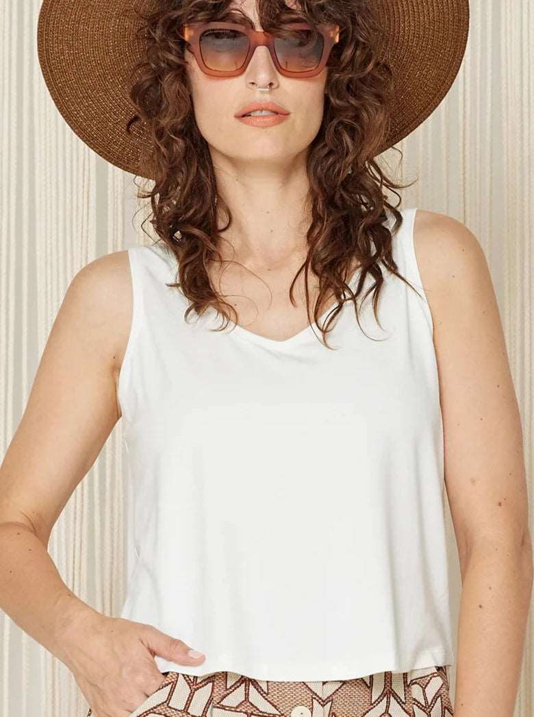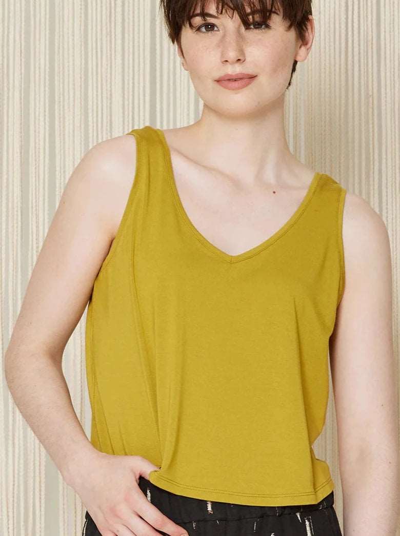 Jolie camisole ample dans un tissu extensible avec une encolure en « V » au devant. Un essentiel de la garde robe, disponible dans de jolies teintes estivales!