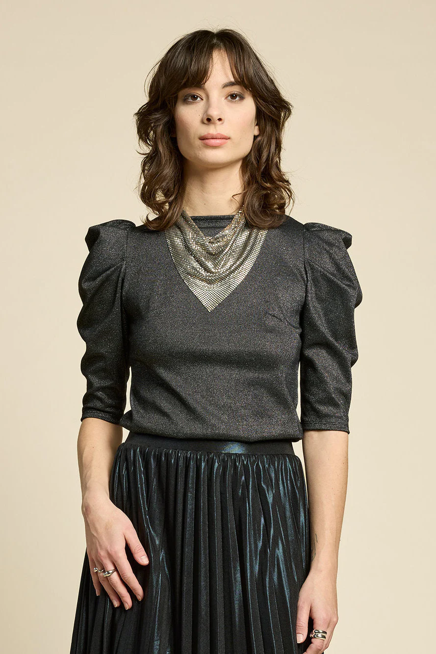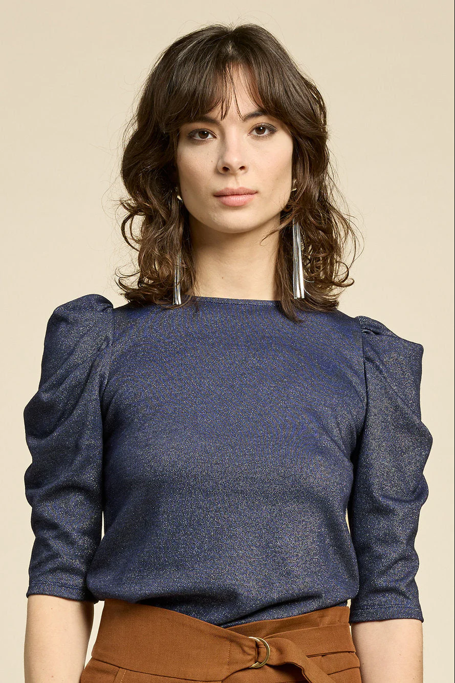 Haut à col rond, confectionné dans un tissu brillant tricoté à Montréal. On adore ses manches bouffantes qui ajoutent un joli volume à la silhouette.