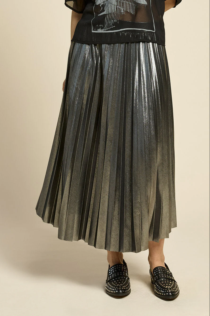 Jolie jupe midi en tissu brillant, parfaite pour les fêtes ou pour un événement. La jupe FEYER fera sensation avec ses plis soleil et son tissu festif. Elle est disponible en noir ou argent.