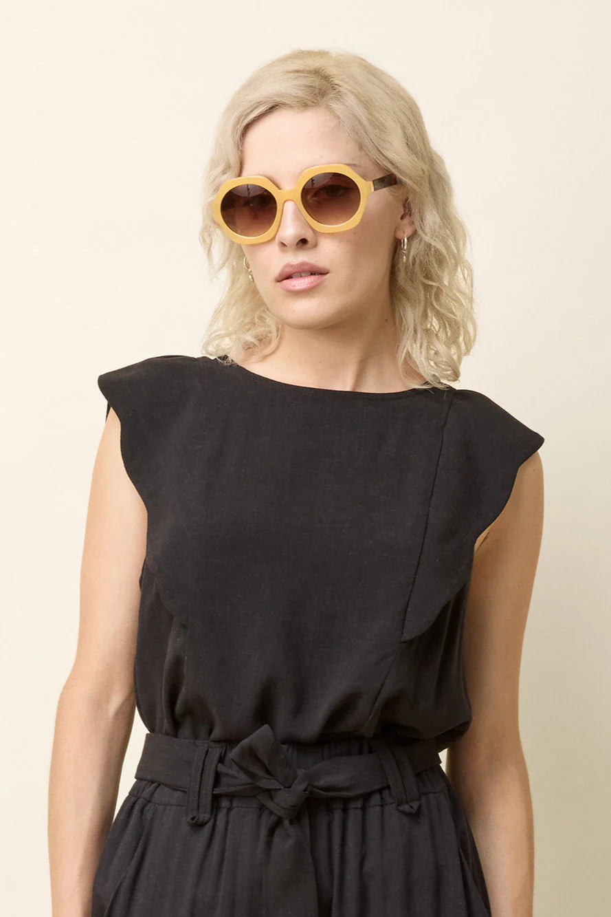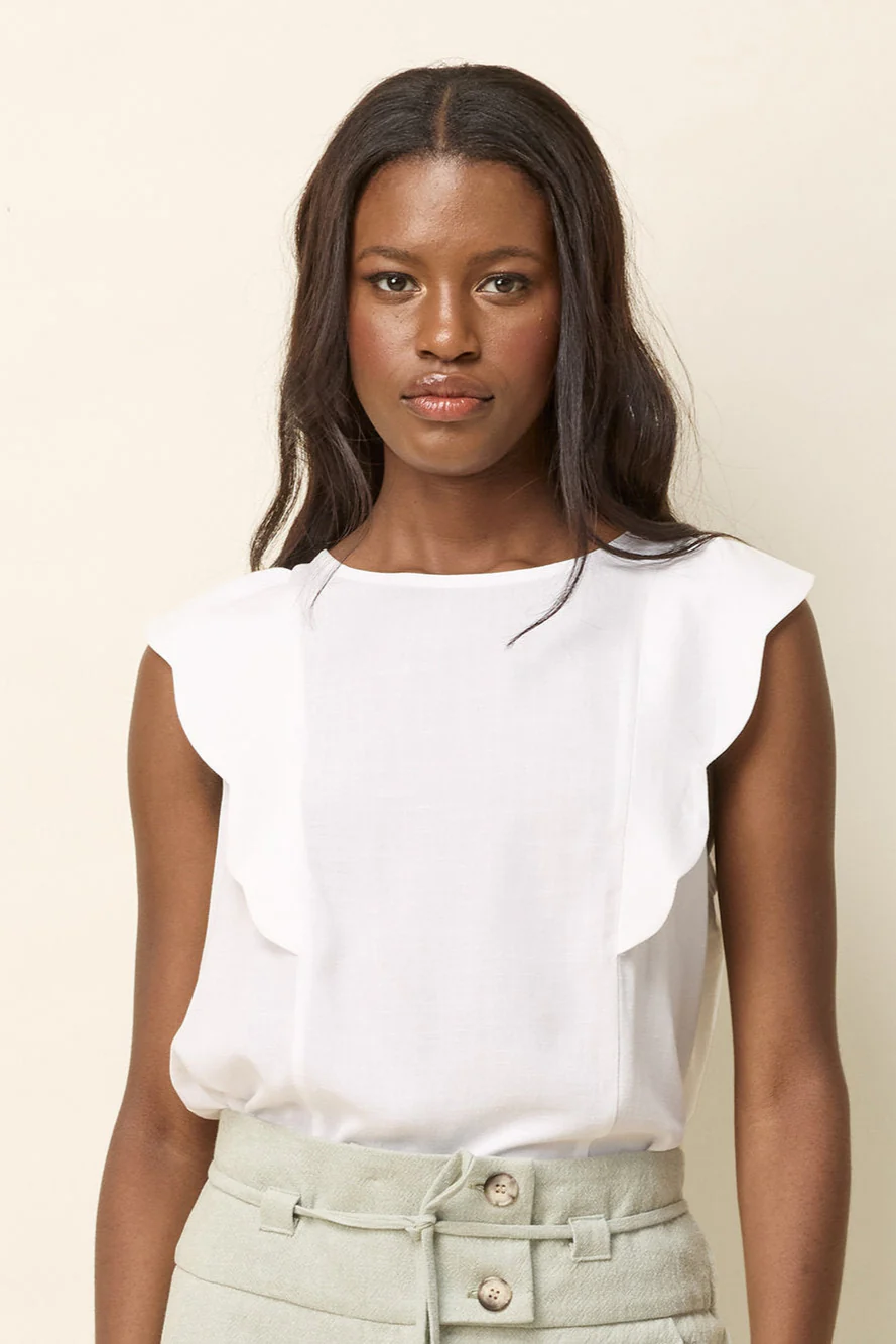 Création locale, faite avec amour et talent à Montréal. Magnifique top léger sans manches, on adore l’aspect ondulé de ses volants qui couvrent les épaules. Disponible en plusieurs teintes, il ira parfaitement avec votre pantalon préféré Détails volantés ondulés Encolure ronde Longueur mi-hanches Composition : 85% Viscose – 15% Lin