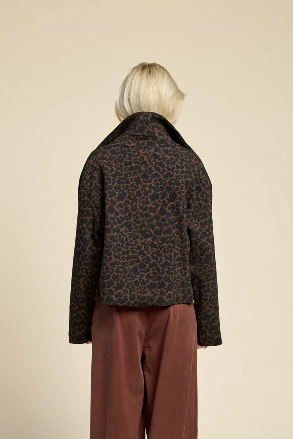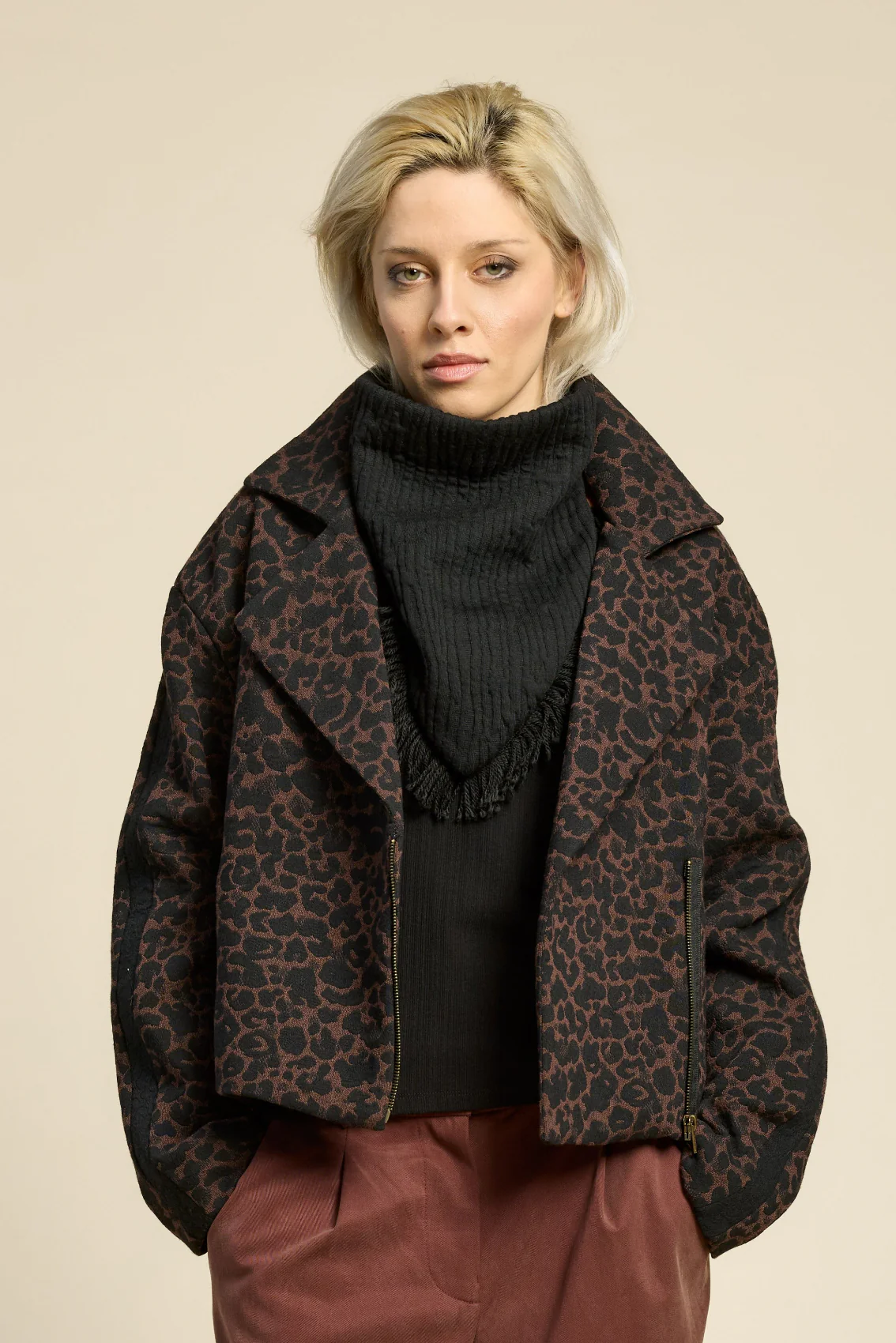 Une veste d’automne style perfecto dans un de nos tissus phare de la saison : notre jacquard à motifs léopard. Une veste courte et ample, fermée par un zip. On adore son détail de bande sur la manche. Un modèle à adopter sans plus tarder!