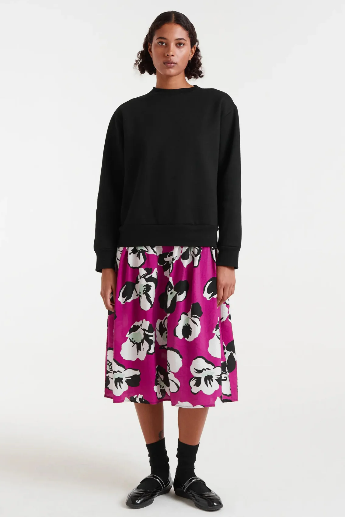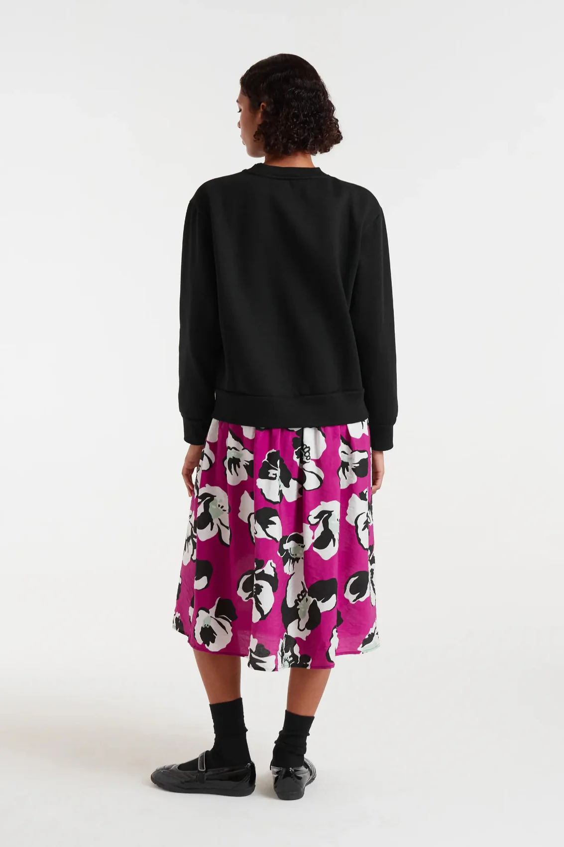 Robe midi à imprimé Viola vif. Combinaison de polaire pour le haut et de crêpe pour la jupe. Col rond et manches longues. Épaules légèrement tombantes Le mannequin mesure 175 cm et porte une taille S.