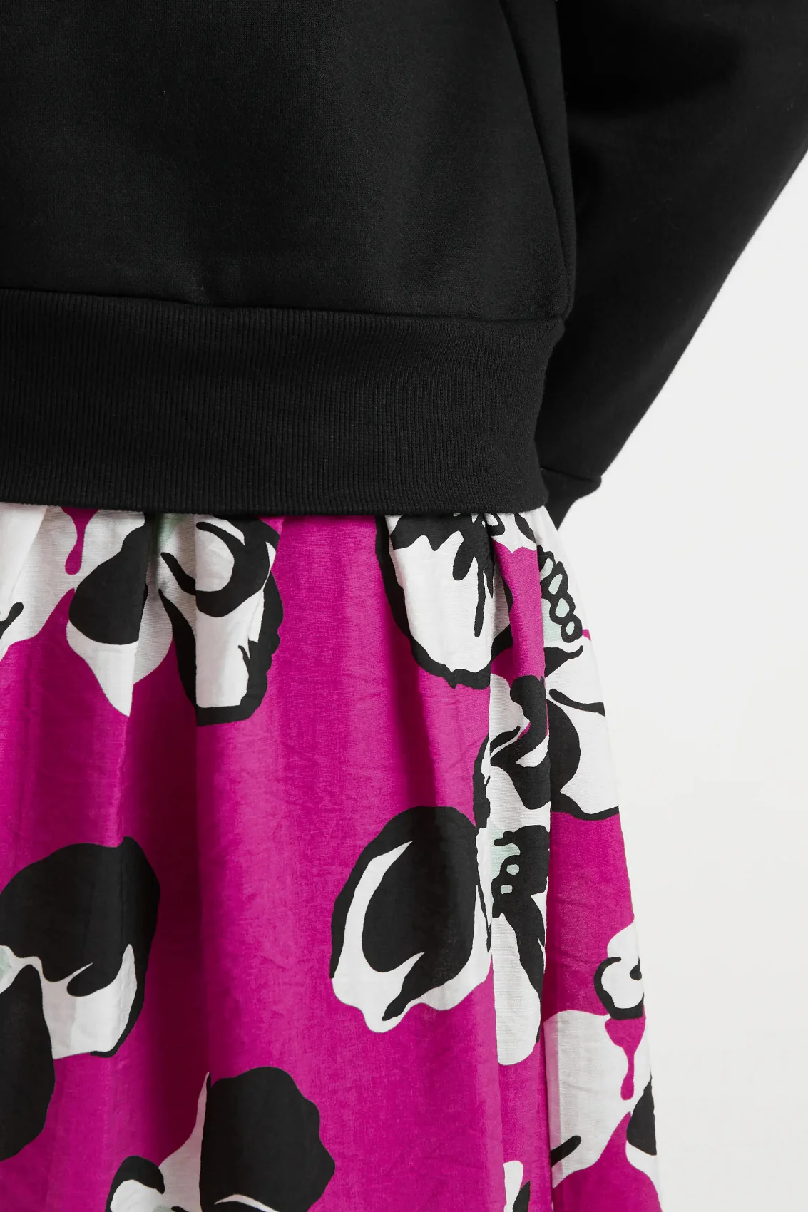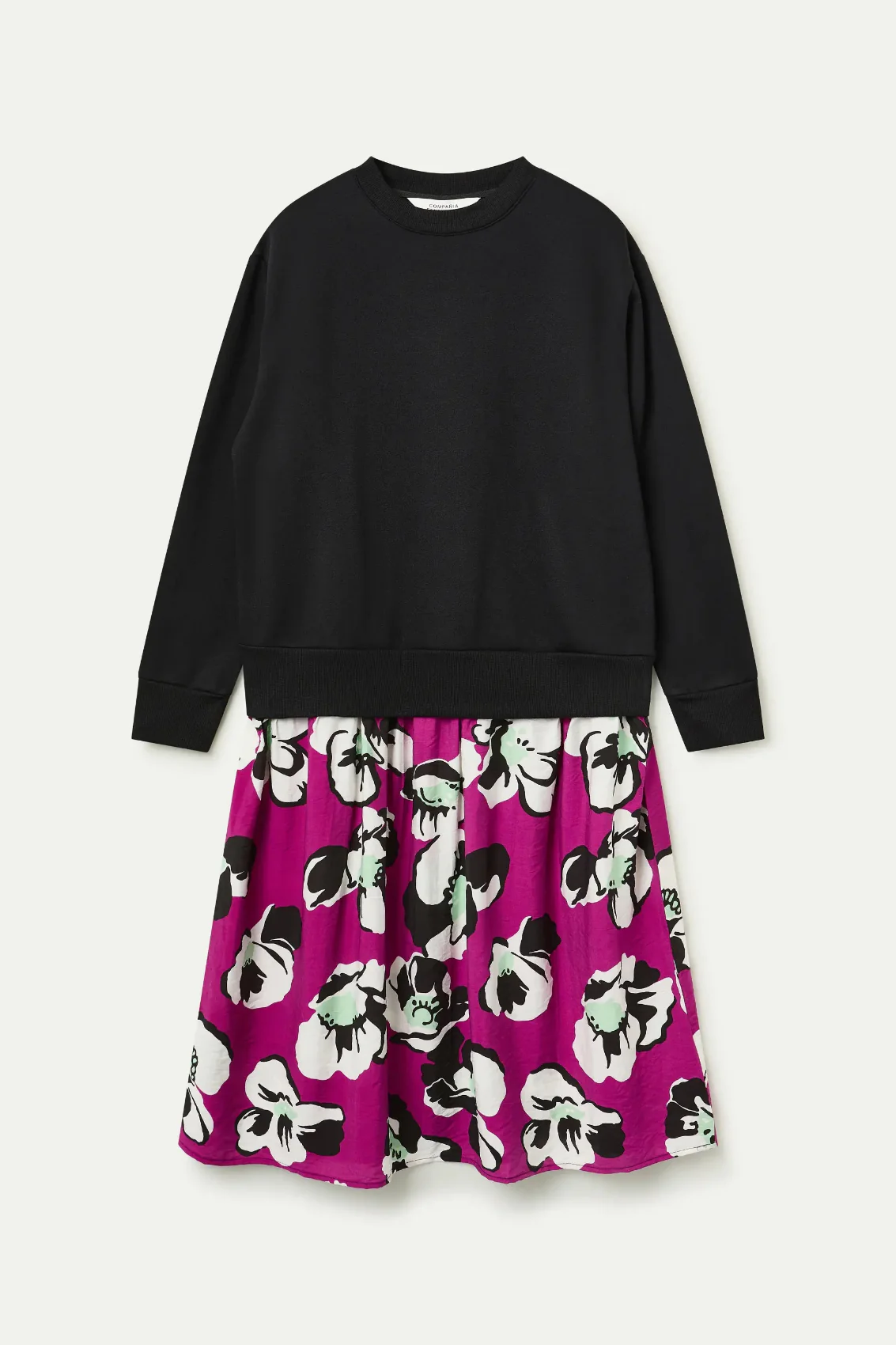 Robe midi à imprimé Viola vif. Combinaison de polaire pour le haut et de crêpe pour la jupe. Col rond et manches longues. Épaules légèrement tombantes