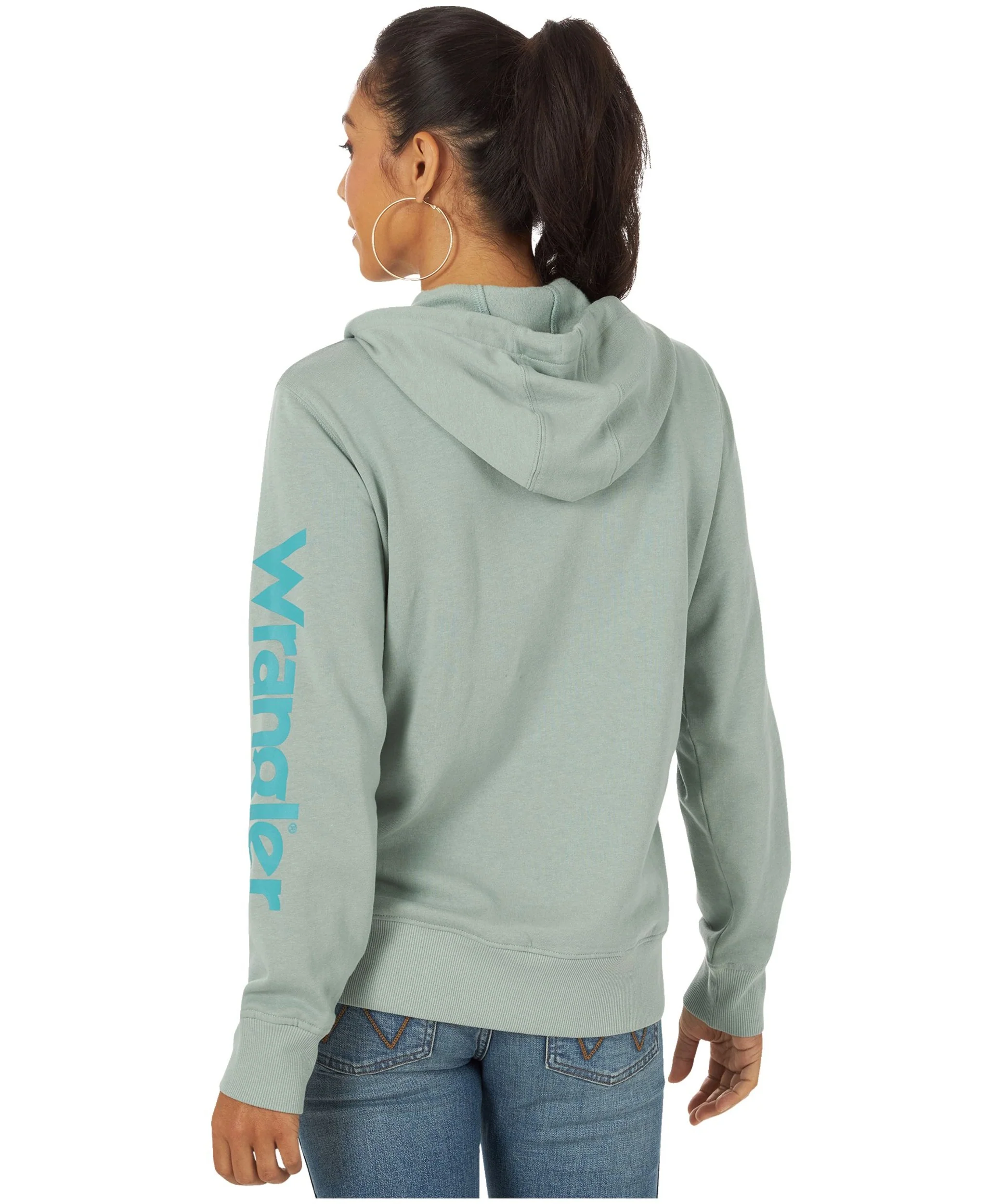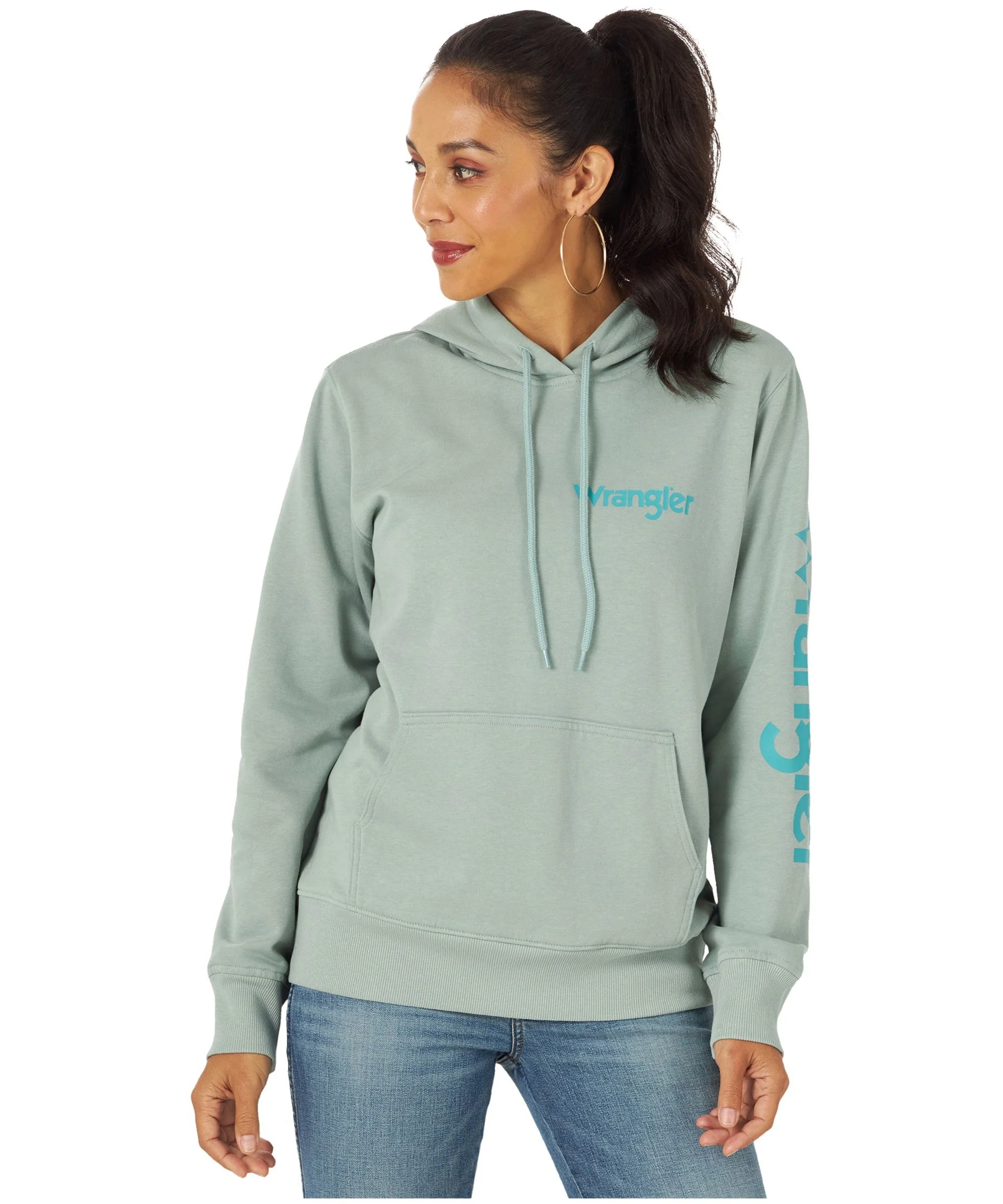 Coton Ouaté Wrangler Femme Retro LWK Knit Teal Punchy 112317301 Sweat à capuche turquoise. Manches longues. Tirer des ficelles. Poche kangourou. Logo Aqua Wrangler sur la poitrine. Logo Aqua Wrangler sur la manche gauche. 80 % coton, 20 % polyester.