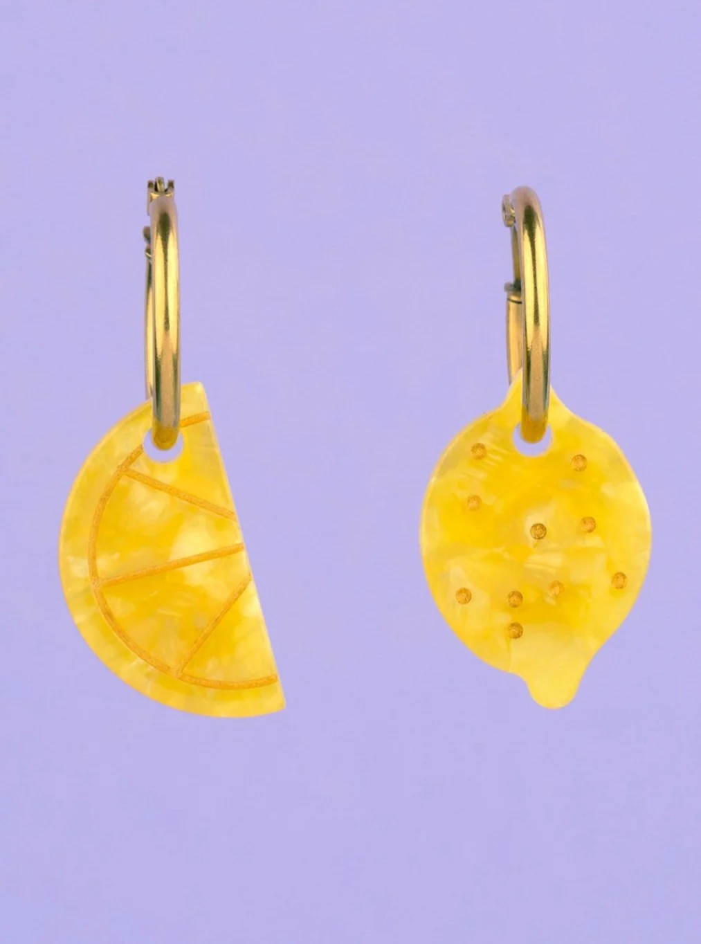 Un zeste ou plus si affinités… Deux jolis petits citrons dépareillés suspendus à d’intemporels anneaux plaqués or : un citron entier d’un côté, un petit quartier (en clin d’Å“il à nos cocktails préférés) de l’autre. De belles boucles d’oreilles acidulées ultra légères à porter et qui nous donnent des airs de Sofia Loren pour crâner tout l’été.