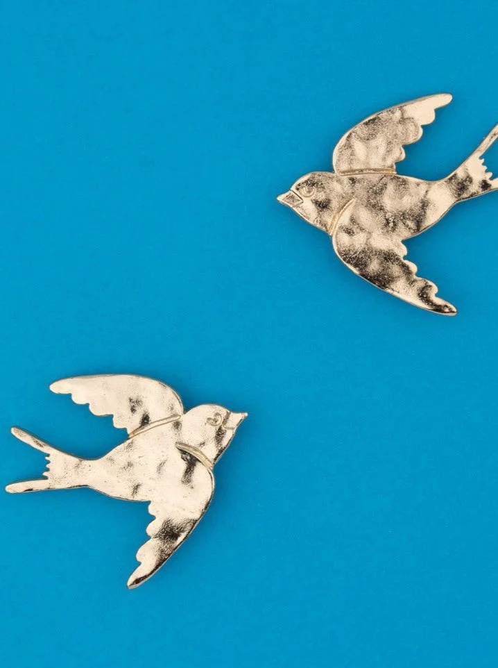 Magnifique paire de boucles d’oreille Hirondelle plaquées or effet martelé. On l’adore porté avec une coiffure haute pour bien mettre en valeur ces beaux oiseaux dorés !
