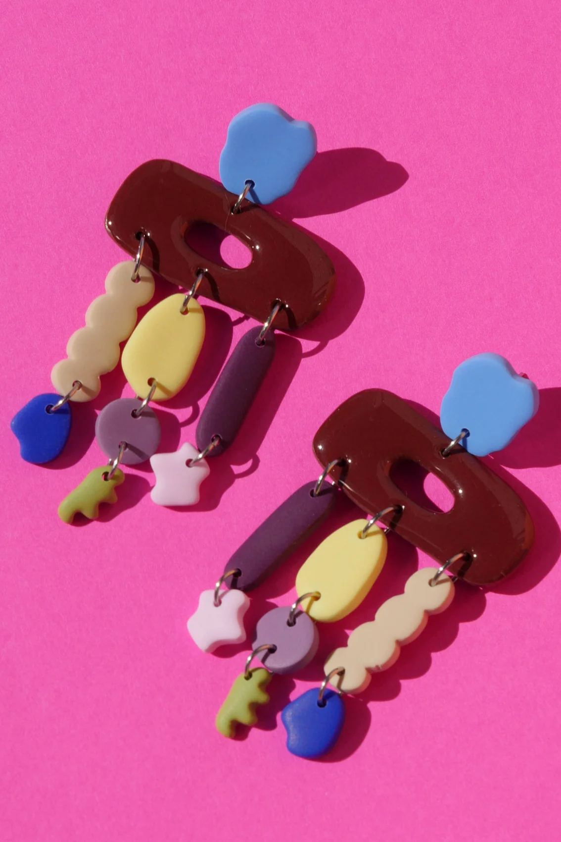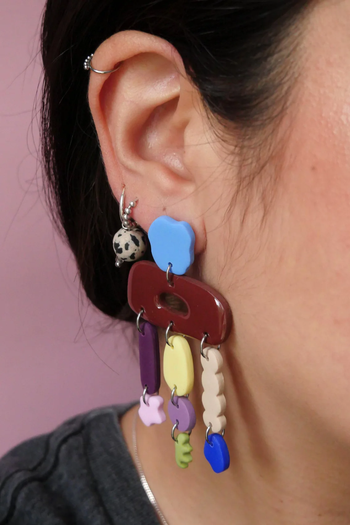 Boucles d’oreilles en argile polymère façonnées avec soin à la main, dans son atelier à Montréal.
