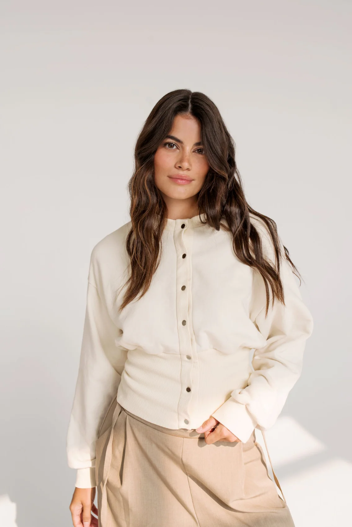 La coupe : Cardigan à manches longues, ajusté au niveau des poignets et de la taille pour un fit flatteur. Fermeture à boutons-pression sur toute la longueur à l’avant.