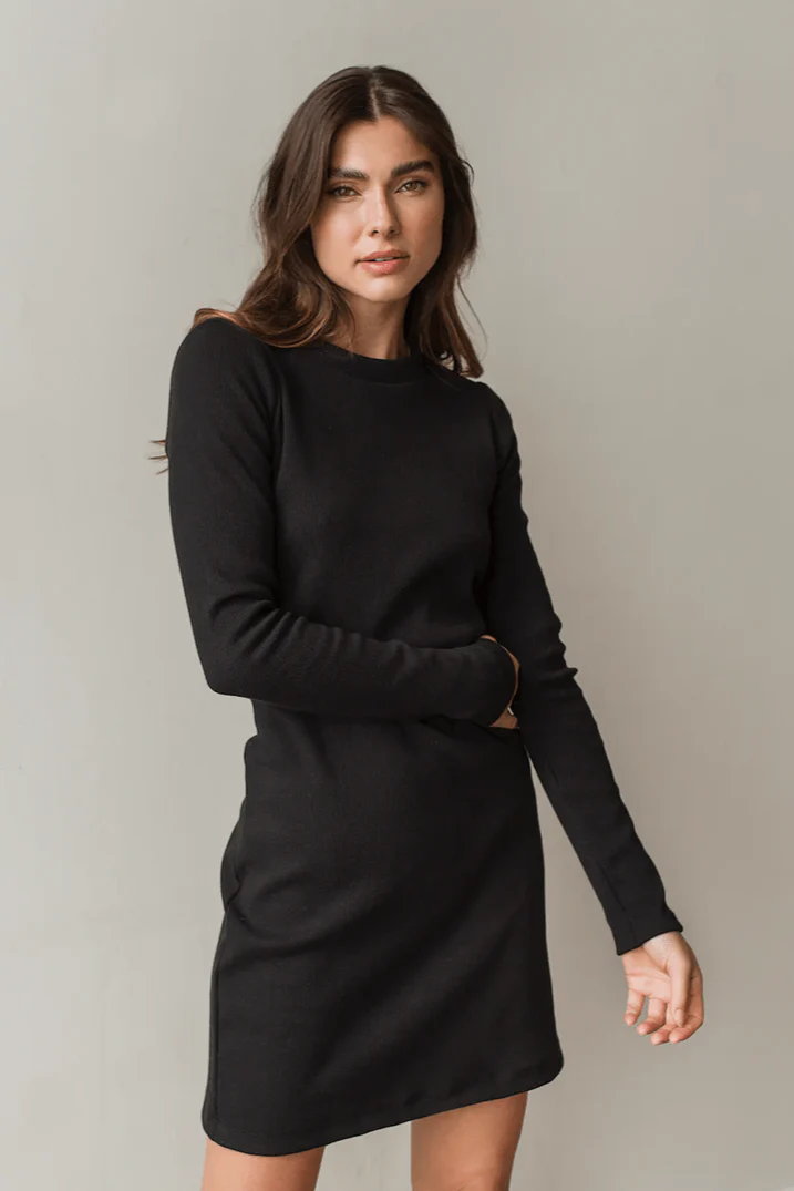 La coupe : Un incontournable de toute garde-robe : la petite robe noire ajustée. Voici ce que vous propose cette nouveauté. Inspirée de la coupe de nos hauts Zoé, la version robe est ajustée aux bras et à la poitrine, et plus droite au niveau du ventre et des hanches.