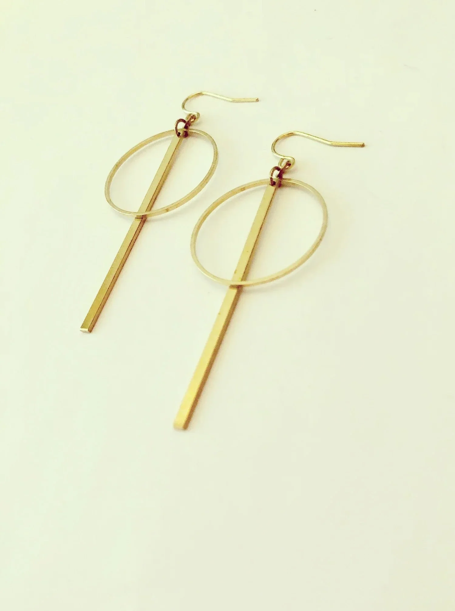 Fait avec amour, talent et passion à Montréal. Boucles d’oreilles pendantes géométriques. Composition : Laiton brut. Dimensions : 1 7/8 « Longueur X 1 » Largeur