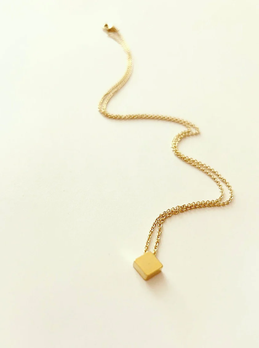 Fait avec amour, talent et passion à Montréal. Collier court avec petite forme carré Matériel : Laiton plaqué or 16K Tailles : 3/8” (Longueur X Largeur) Longueur de la chaîne: 16”