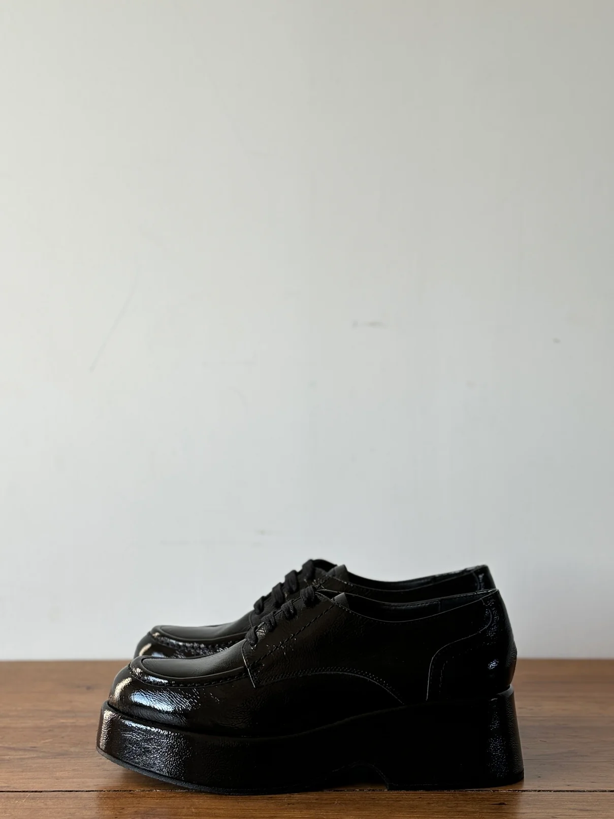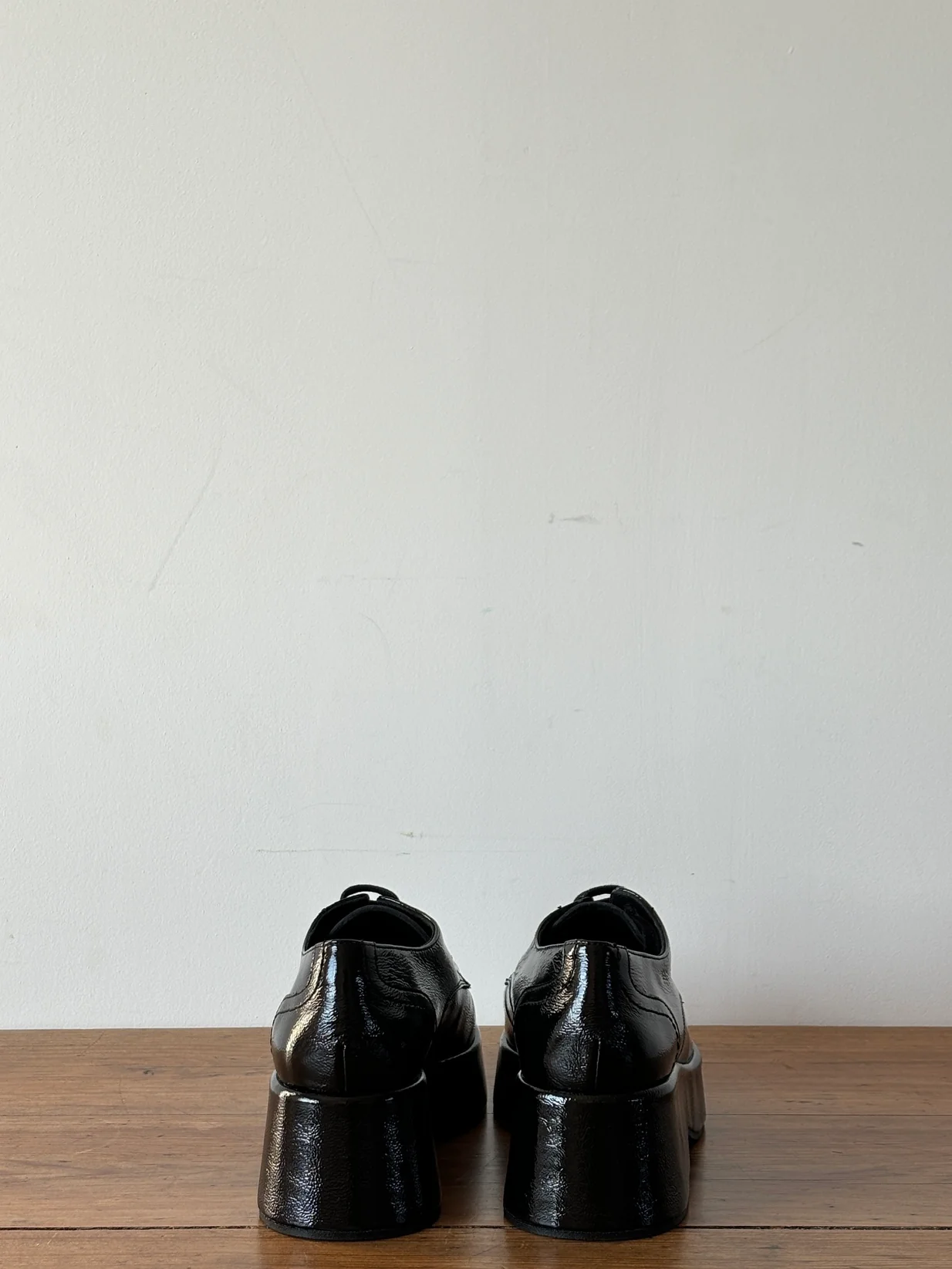 Dessus / Tige : Cuir vernisDoublure : CuirSemelle de propreté : CuirSemelle d’usure : Synthétique Bout de la chaussure : RondForme du talon : Plateforme Hauteur du talon : 6 cm environFermeture : LacetsMotif / Couleur : Noir Marque : JHAYInformations additionnelles : Prenez votre pointure habituelle.