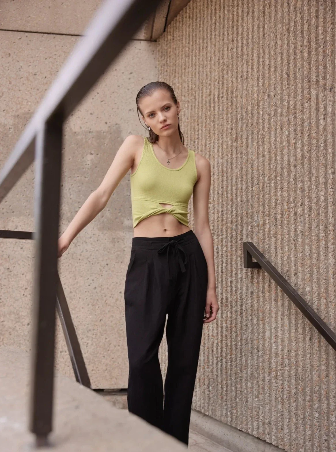 Col rond il est twisté à la taille laissant apparaitre ce dessin de demi-cercle que l’on retrouve tout au long de la collection.