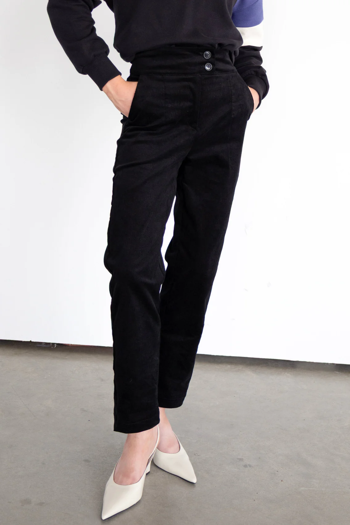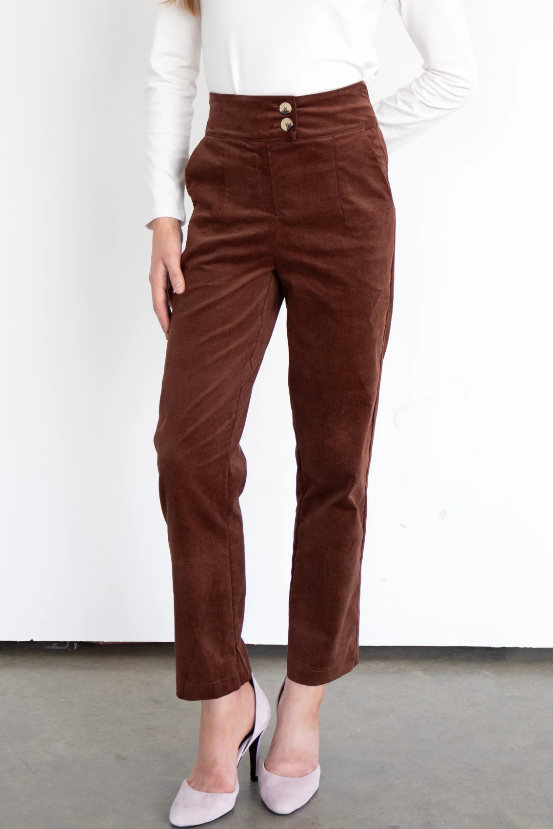 Pantalon taille haute à la coupe droite et à la jambe légèrement fuselée — une silhouette flatteuse, parfaite autant pour le travail que pour les sorties. Il est doté d’un fermoir YKK à l’avant, de poches latérales en biais et d’une ceinture large à double boutonnage.