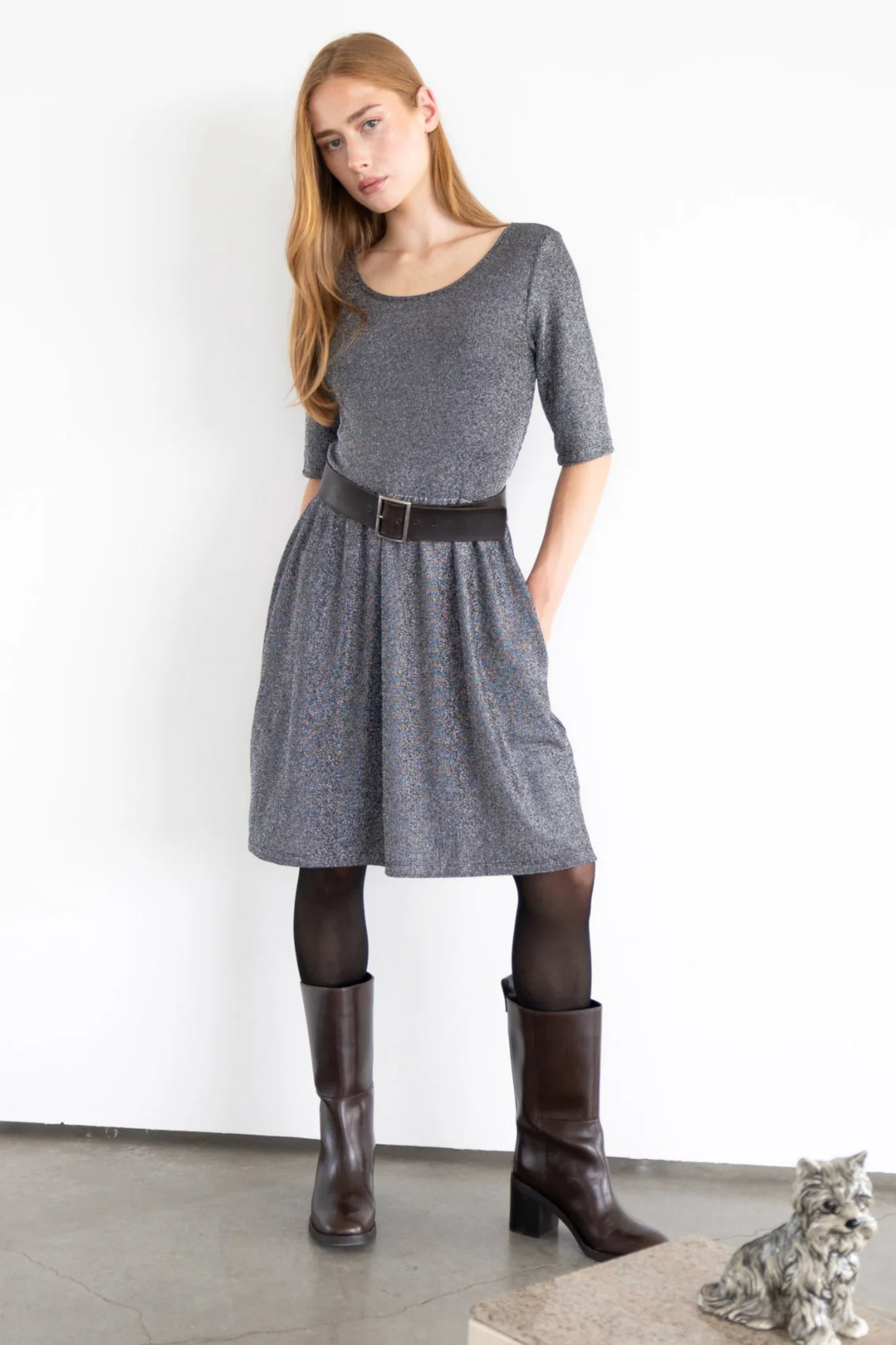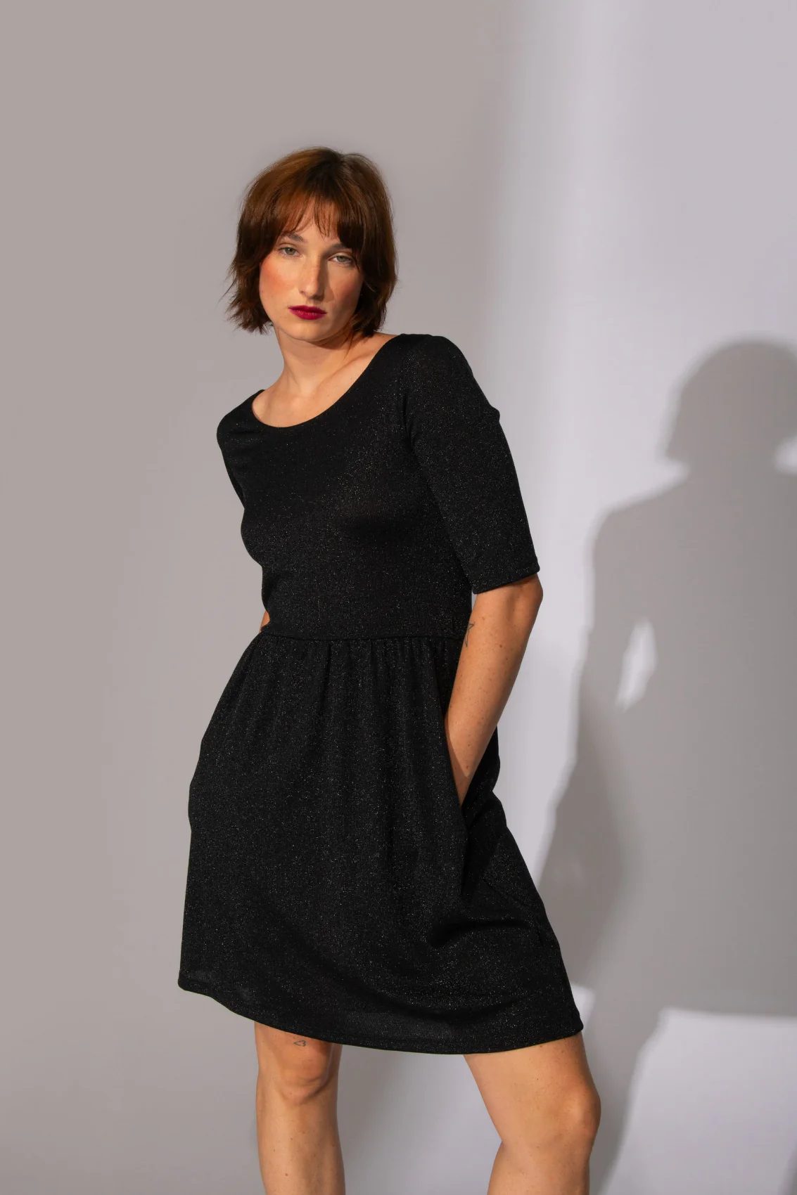 Robe classique et polyvalente alliant confort et style. Col arrondi à l’avant, dos en « V » élégant, et poches latérales pratiques. Disponible en tissu scintillant extensible pour profiter pleinement de vos soirées.