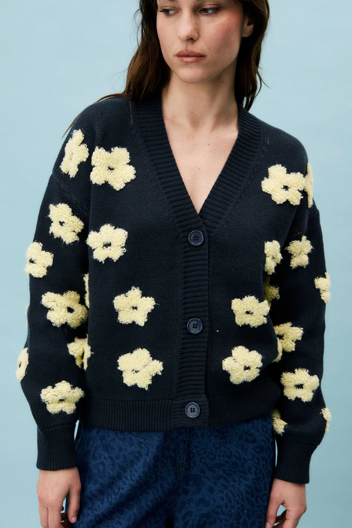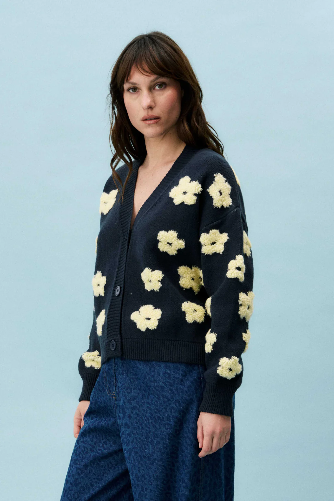 • Cardigan en coton• Motif à fleurs• Encolure en V• Se ferme avec des boutons Taille : Conseil : Si vous hésitez entre deux tailles, choisissez plutôt la plus petite. Composition : 48% Acrylique – 31% Polyester – 21% Coton Lavage à la main à l’eau froide
