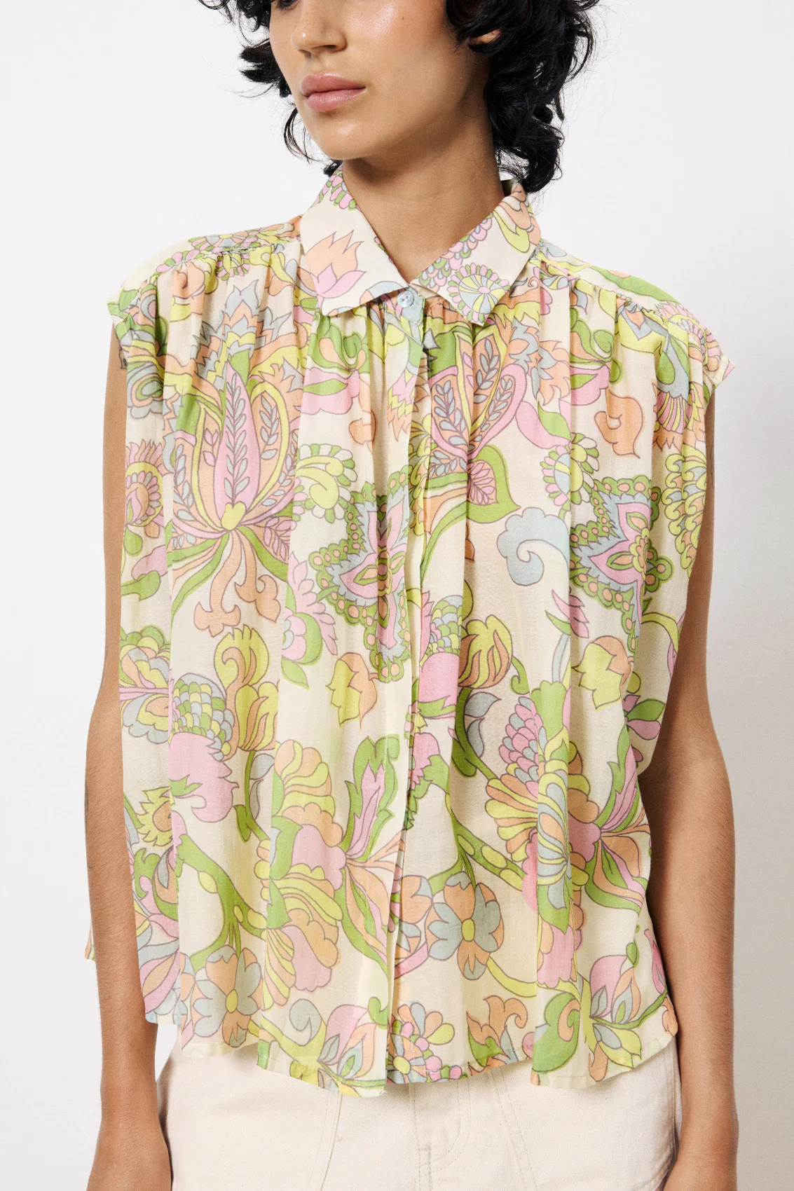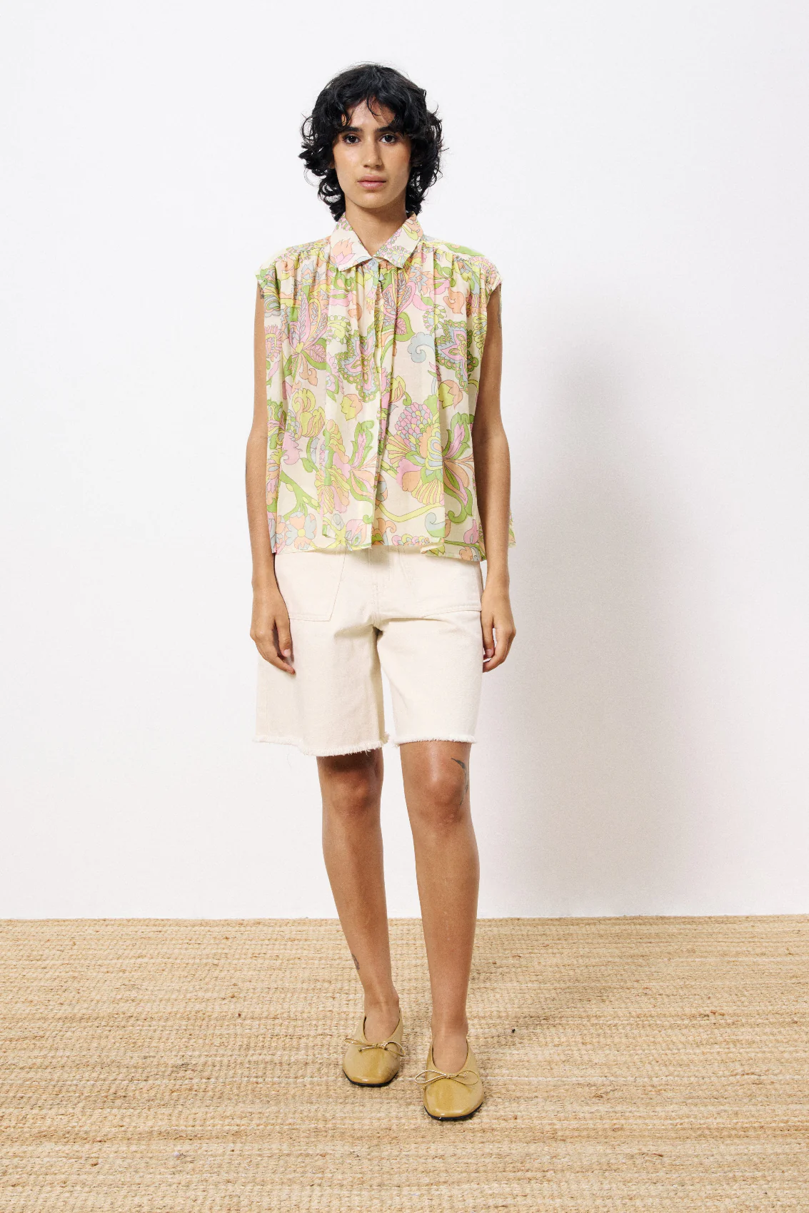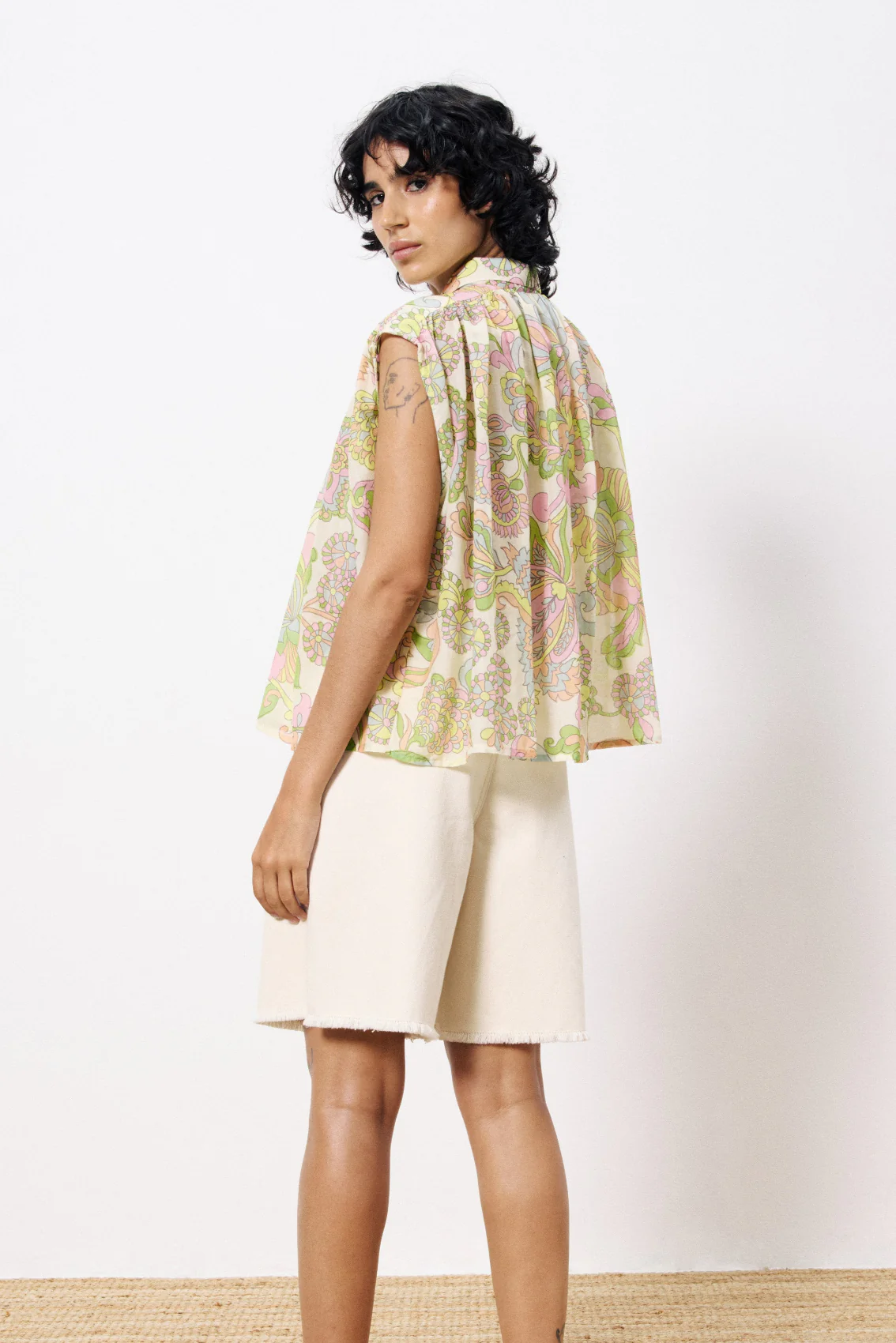 • Chemise sans manches fluide• Col chemise• Print Exclusif FRNCH Taille : Si vous hésitez entre deux tailles, choisissez plutôt la plus petite. Composition : 73% Coton – 27% Soie Lavage à la main à l’eau froide