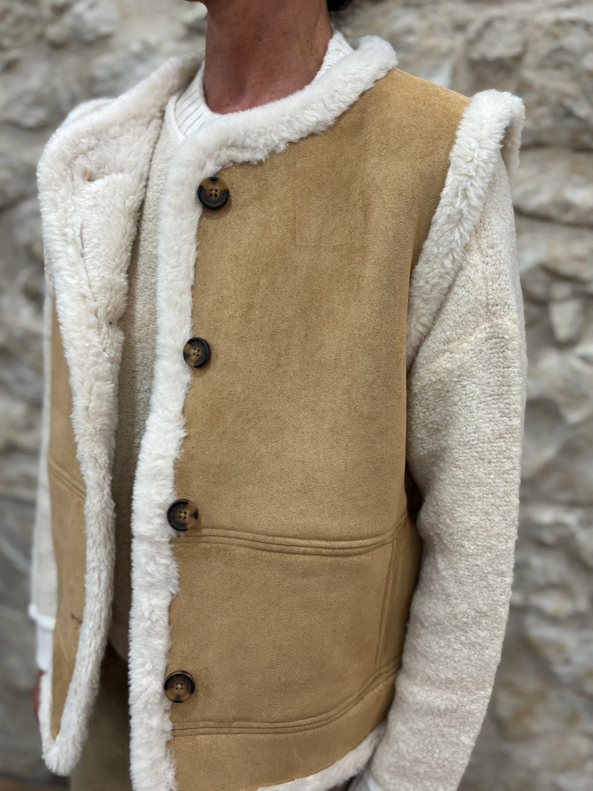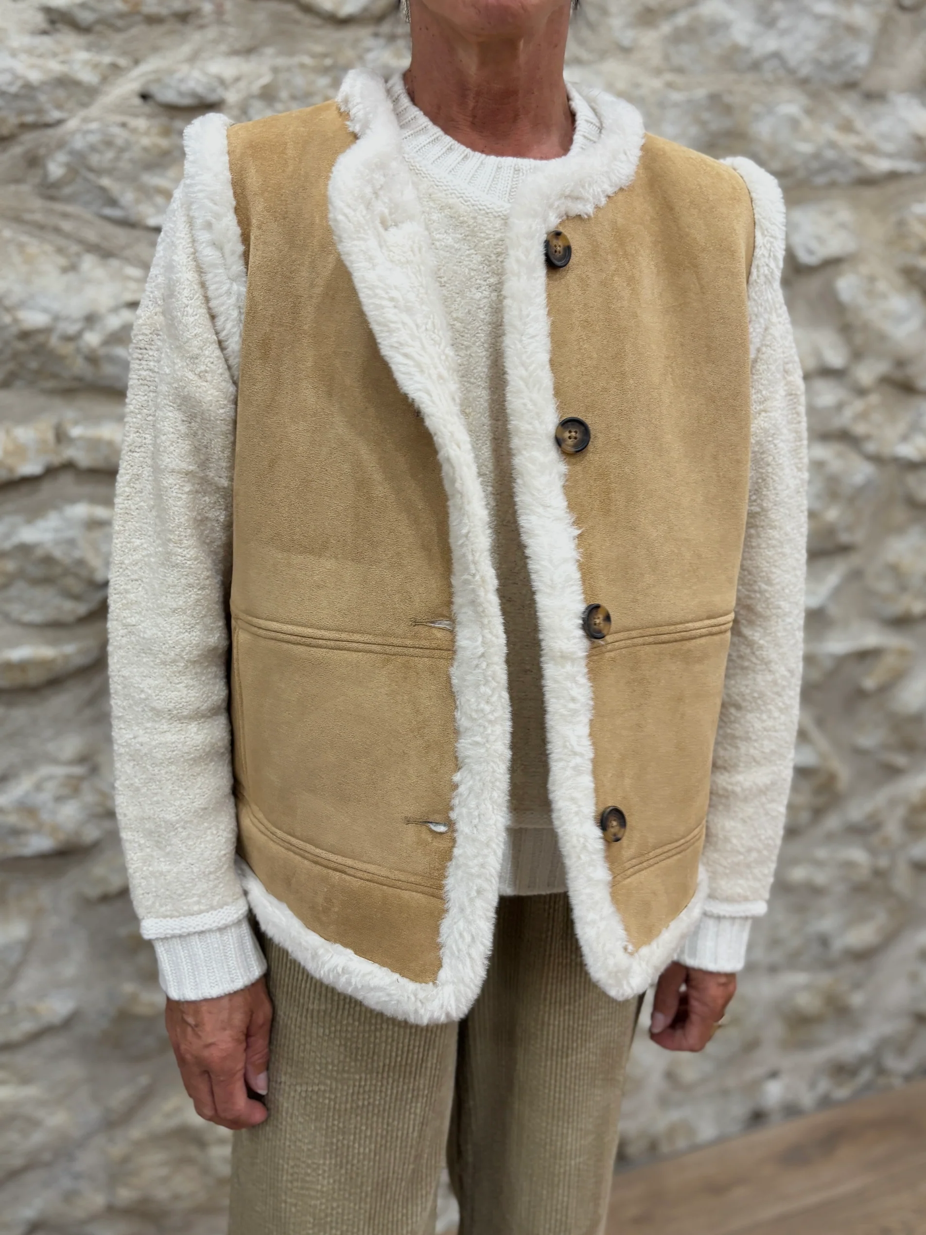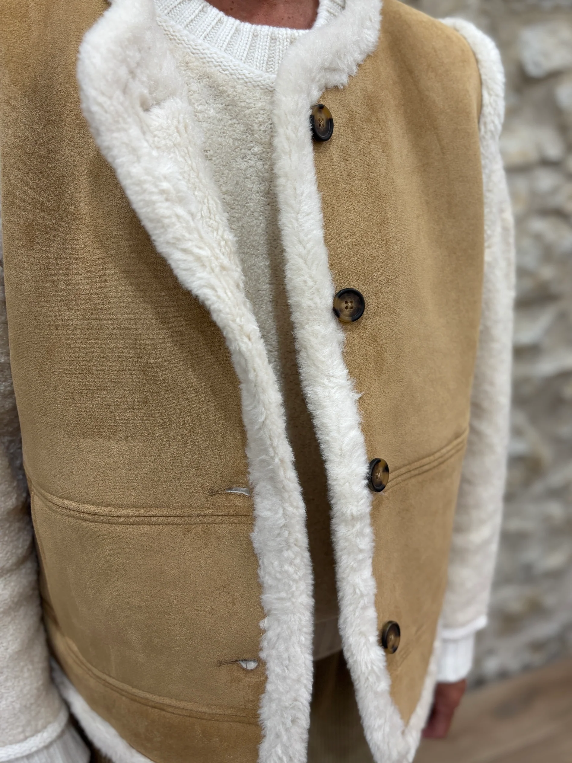 Matières : Polyester et élasthanne. Doublure et bordure en fourrure synthétique. Coupe : Coupe droite (longueur dos – taille 36 – 59 cm) avec deux poches latérales et un boutonnage avant.Forme du col : Col rondLongueur des manches : Sans manches Couleurs / Motifs : Beige et blanc Notre modèle porte une taille 36 et […]