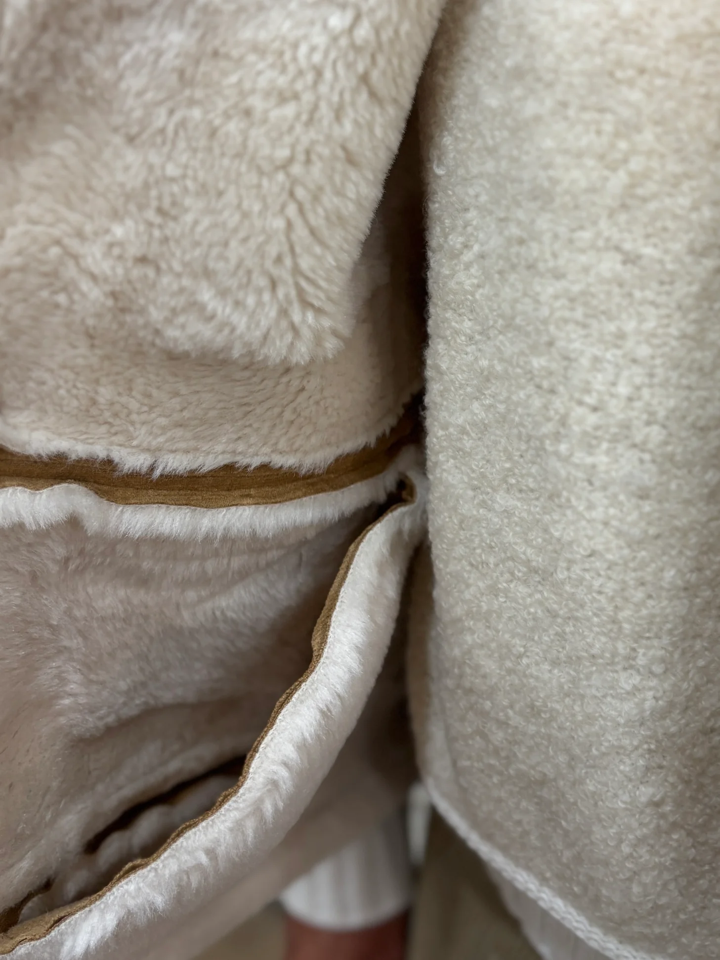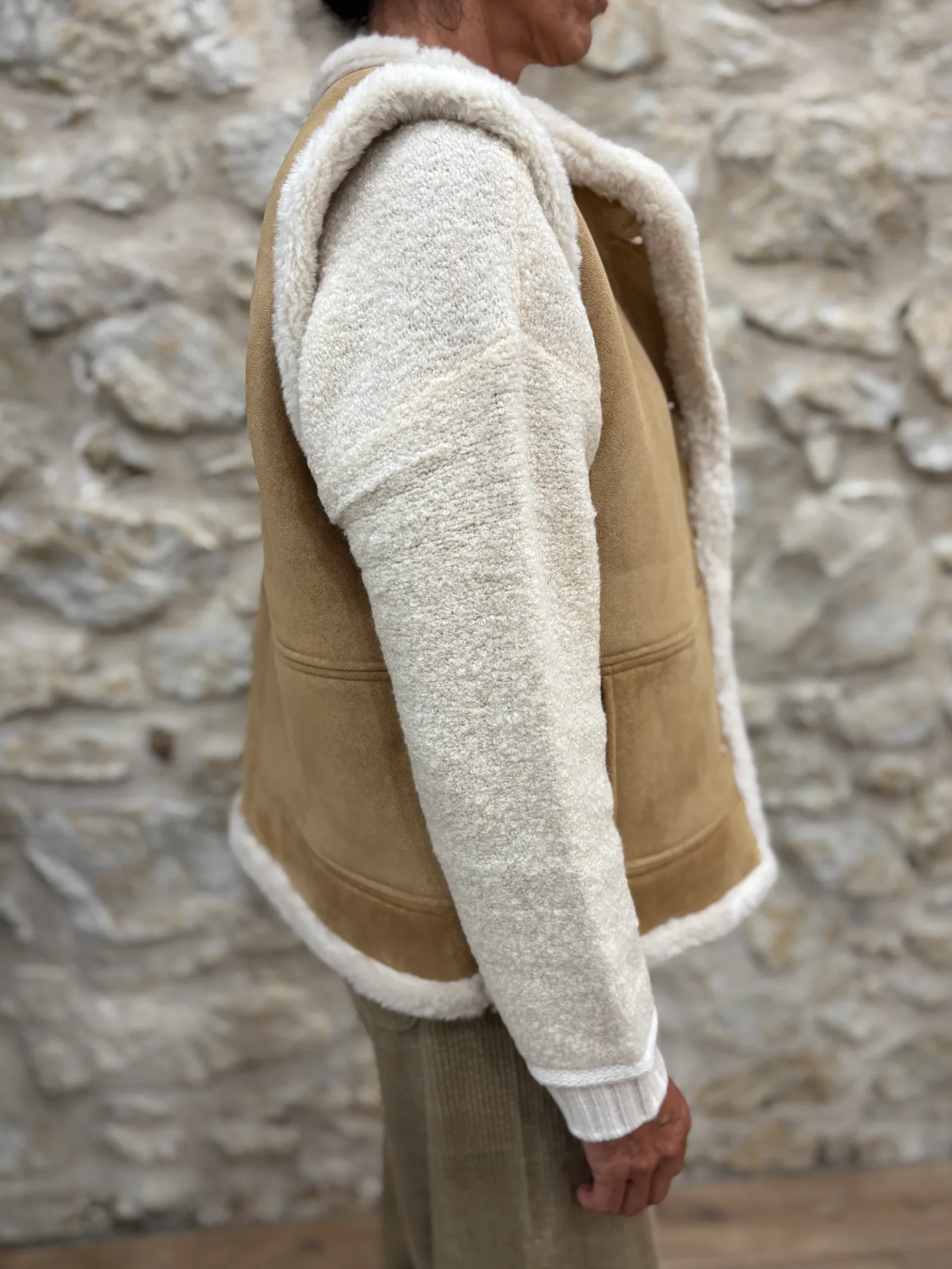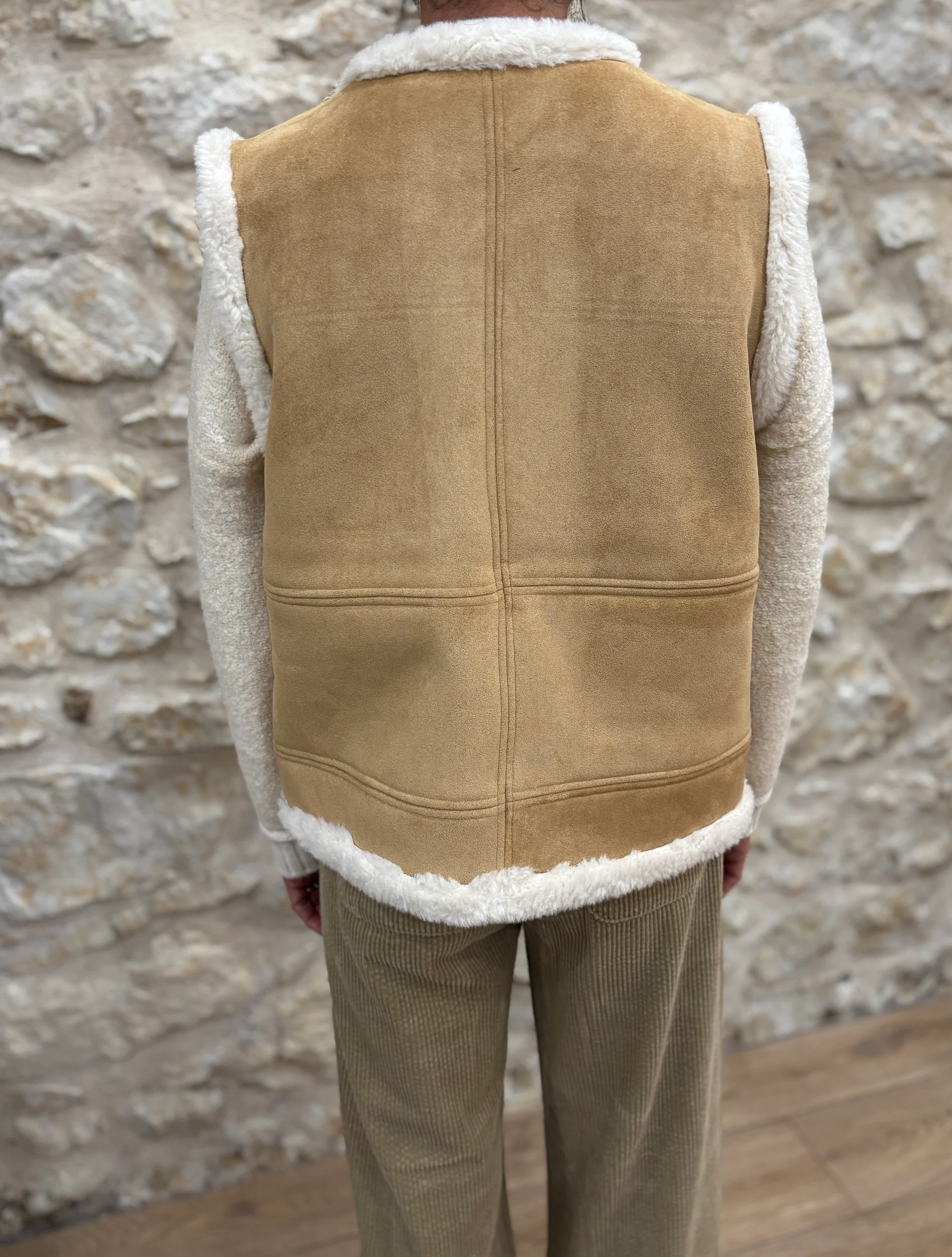 Matières : Polyester et élasthanne. Doublure et bordure en fourrure synthétique. Coupe : Coupe droite (longueur dos – taille 36 – 59 cm) avec deux poches latérales et un boutonnage avant.Forme du col : Col rondLongueur des manches : Sans manches Couleurs / Motifs : Beige et blanc Notre modèle porte une taille 36 et […]