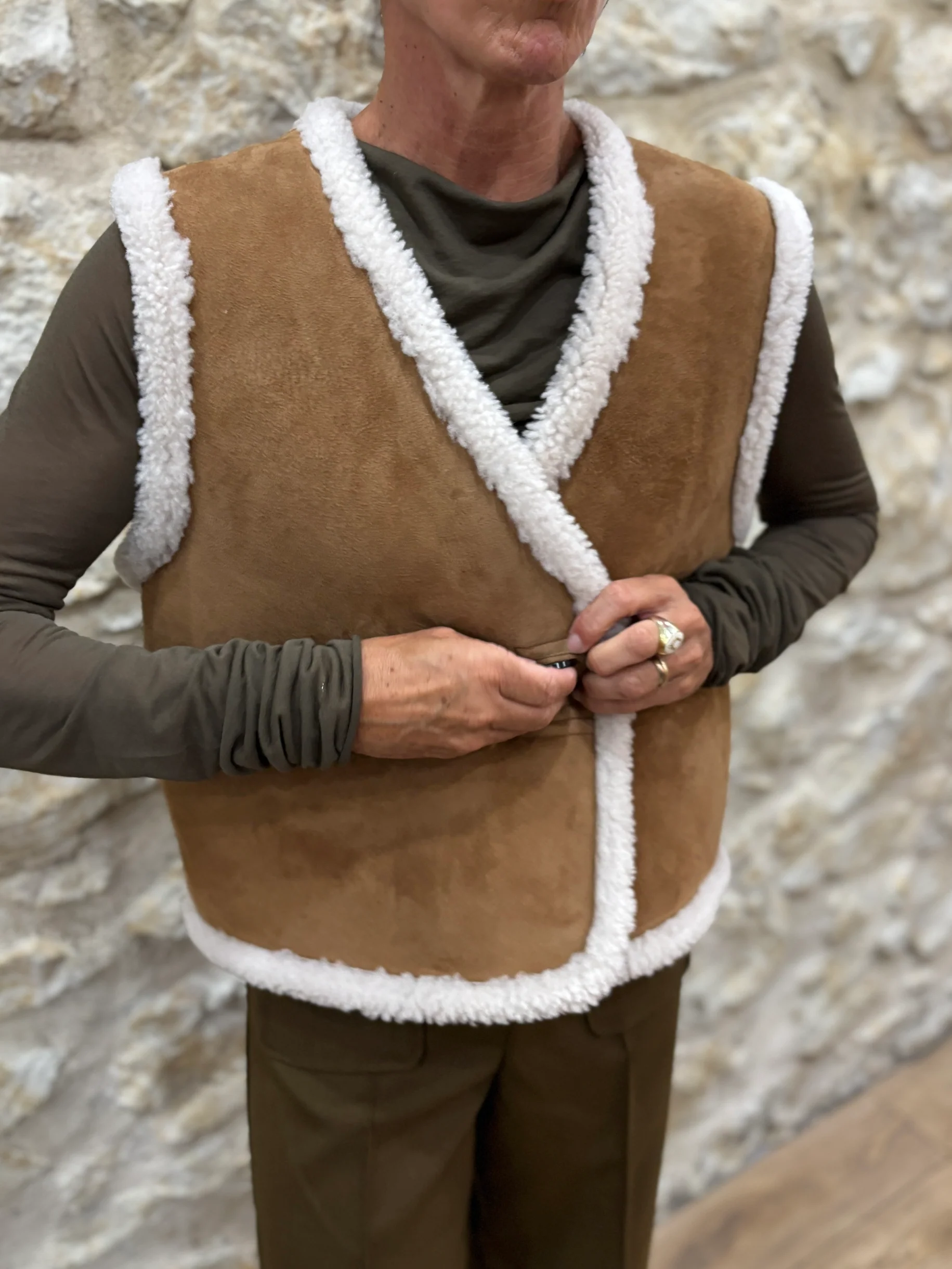 Matières : Cuir d’agneau Coupe : Coupe droite cache coeur asymétrique. OuvertureLargeur du bas : Sans manchesFermeture : Ouverture boutonnéeCouleurs / Motifs : Miel Notre modèle porte une taille 1 et mesure 165 cm. Nom du modèle : PYRÉNÉESMarque : SOEUR PARIS Conseils d’entretien : Dans un pressingInformations supplémentaires :
