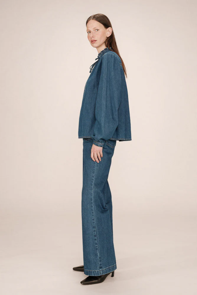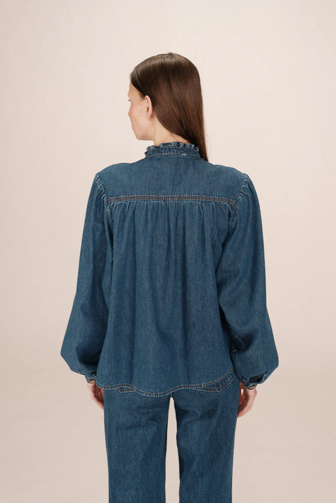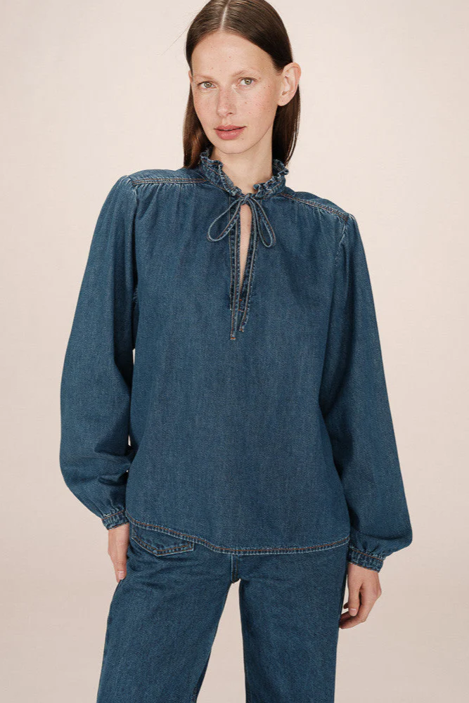 La blouse à manches longues SALSA revisite le denim avec une touche de féminité délicate. Le col orné de petits volants et le lien à nouer apportent une note romantique à cette pièce du quotidien. La coupe droite et ces fronces discrètes structurent la silhouette. La pièce présente une encolure ouverte avec un lien à nouer sur le devant.