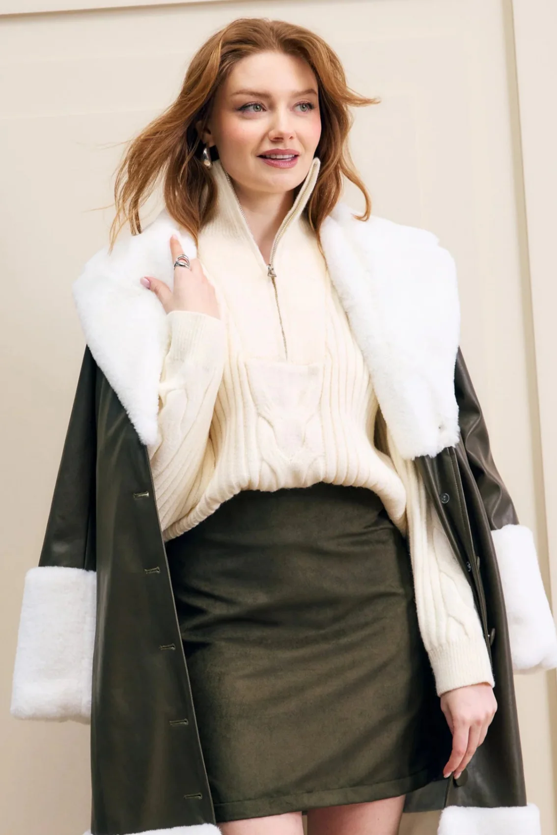 Ce pull d’hiver chic en maille torsadée à demi-zip allie design intemporel et confort moderne. Il arbore des motifs torsadés complexes, un col montant douillet orné de détails argentés et des manches longues d’un blanc antique crémeux. Sa silhouette classique offre une grande polyvalence et s’adapte à de nombreuses tenues, ce qui en fait un indispensable à toute garde-robe soignée.
