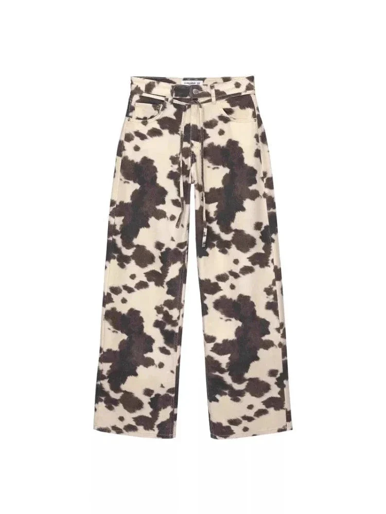 Jean femme imprimé vache Y2K à jambe large – denim vintage Houzhou