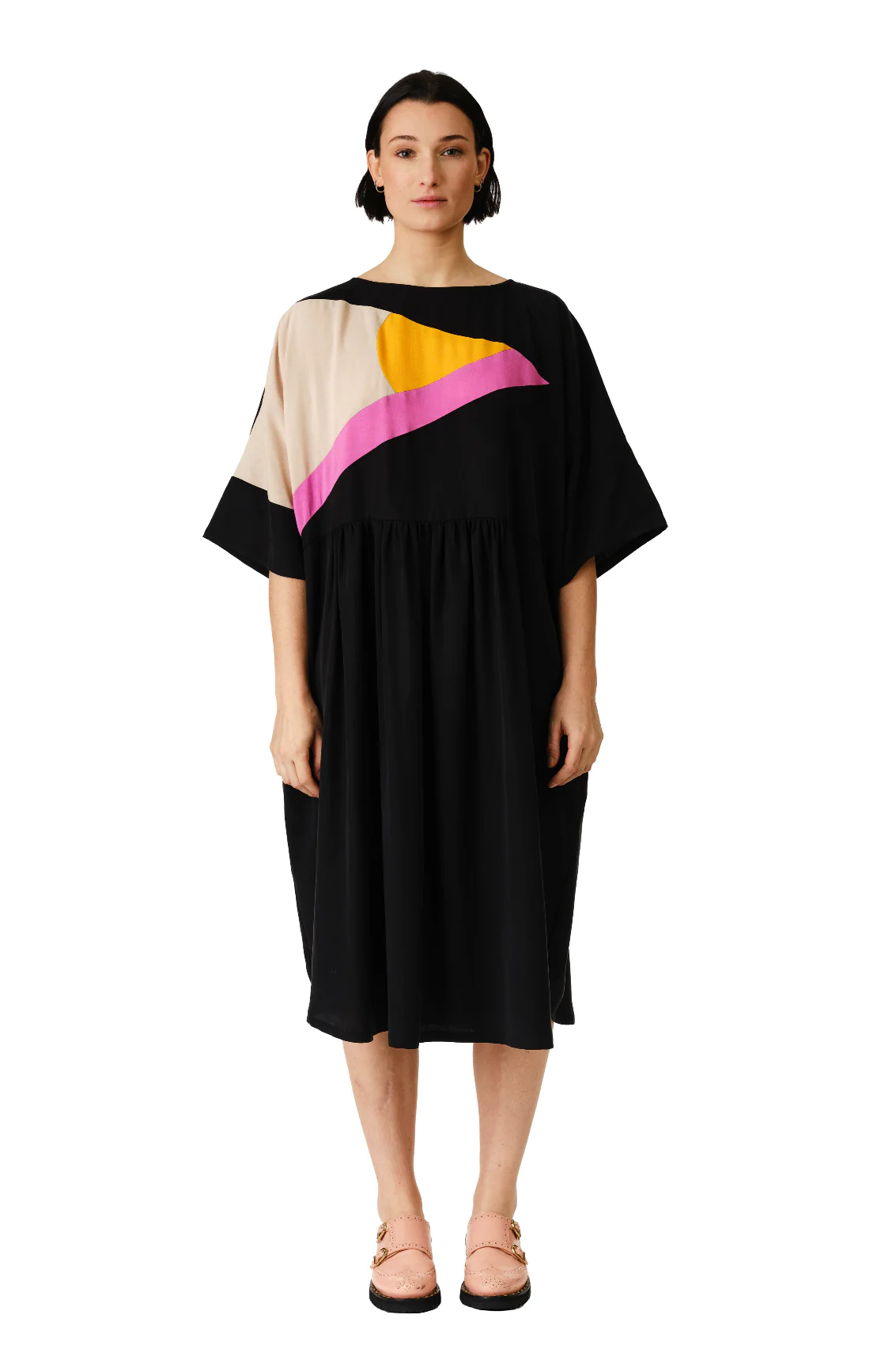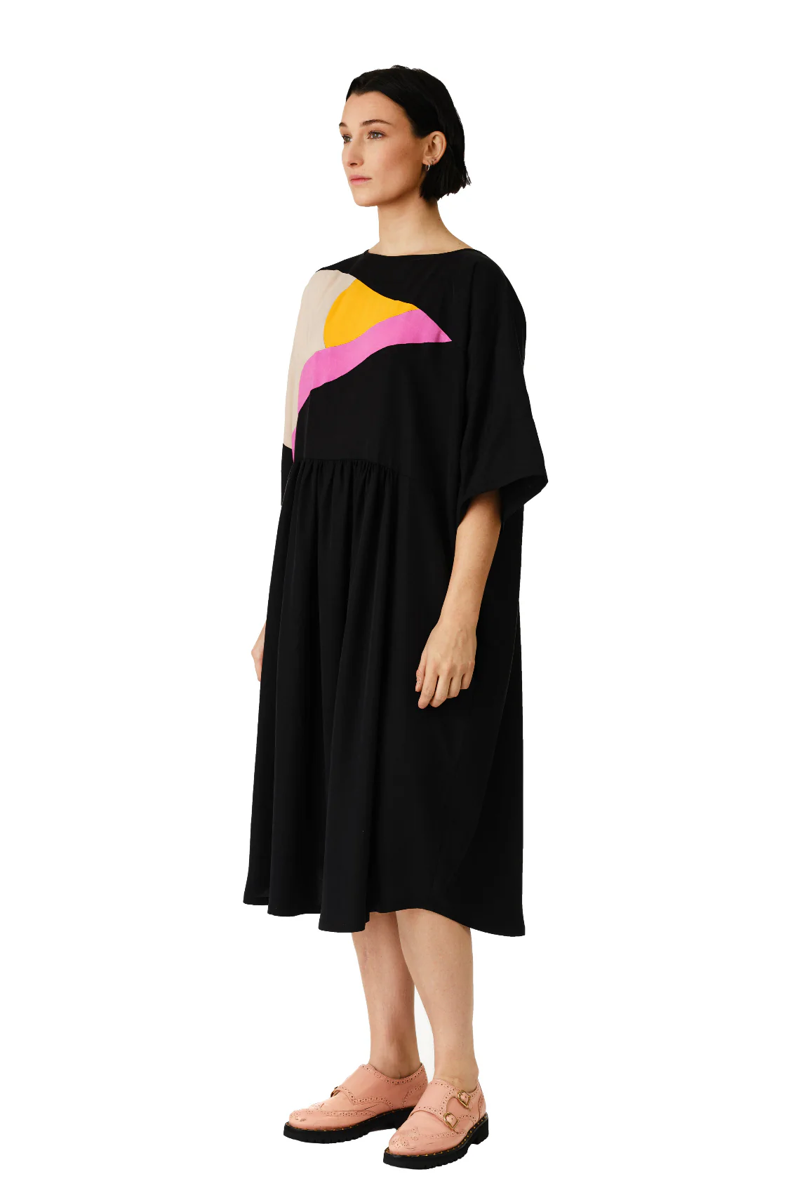 Dans un jeu d’abstraction, Jennifer Glasgow crée l’équilibre avec sa robe colorblock de la saison. Le corsage graphique mêle formes arrondies et angles vifs, capturant la lumière en mouvement. Réalisée en sergé doux de Tencel, la robe Jades présente des manches tombantes et des poches fonctionnelles. Sa longueur mi-mollet et la fluidité du tissu épousent chaque geste. Audacieuse et confortable, elle dessine une silhouette contemporaine qui ne passe pas inaperçue.