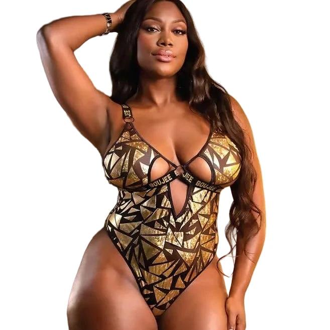 Le body Ilona est une pièce de lingerie fantasy pensée pour sublimer les courbes avec assurance. Son design doré à motif graphique associe transparence maîtrisée et lignes structurées pour un rendu visuel affirmé et élégant. La maille extensible épouse naturellement le corps tout en offrant un excellent confort, spécialement adapté aux silhouettes Queen Size. Le décolleté structuré met en valeur la poitrine grâce à un jeu de découpes géométriques, tandis que la matière légèrement brillante capte la lumière pour un effet sophistiqué sans excès. Les finitions nettes et les coutures précises assurent une tenue stable et agréable à porter.
