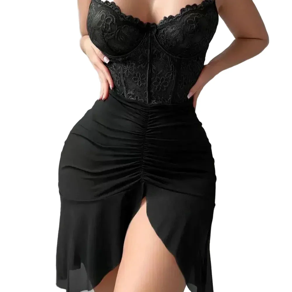 - Ensemble 2 pièces : haut en dentelle et maille plissée + tanga transparent