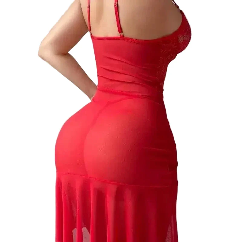 Le tanga transparent assorti complète l’ensemble avec discrétion,