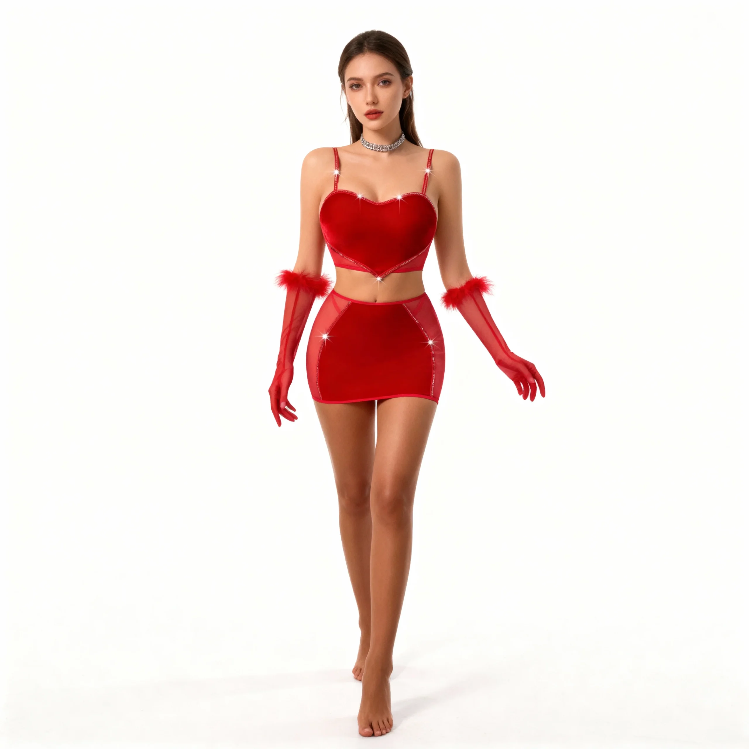 Les Secrets de Léa – Ensemble en velours rouge avec jupe courte et gants – Clara