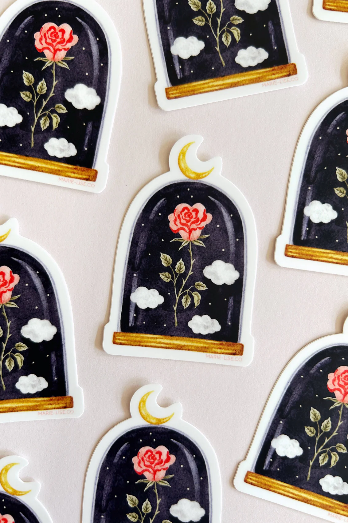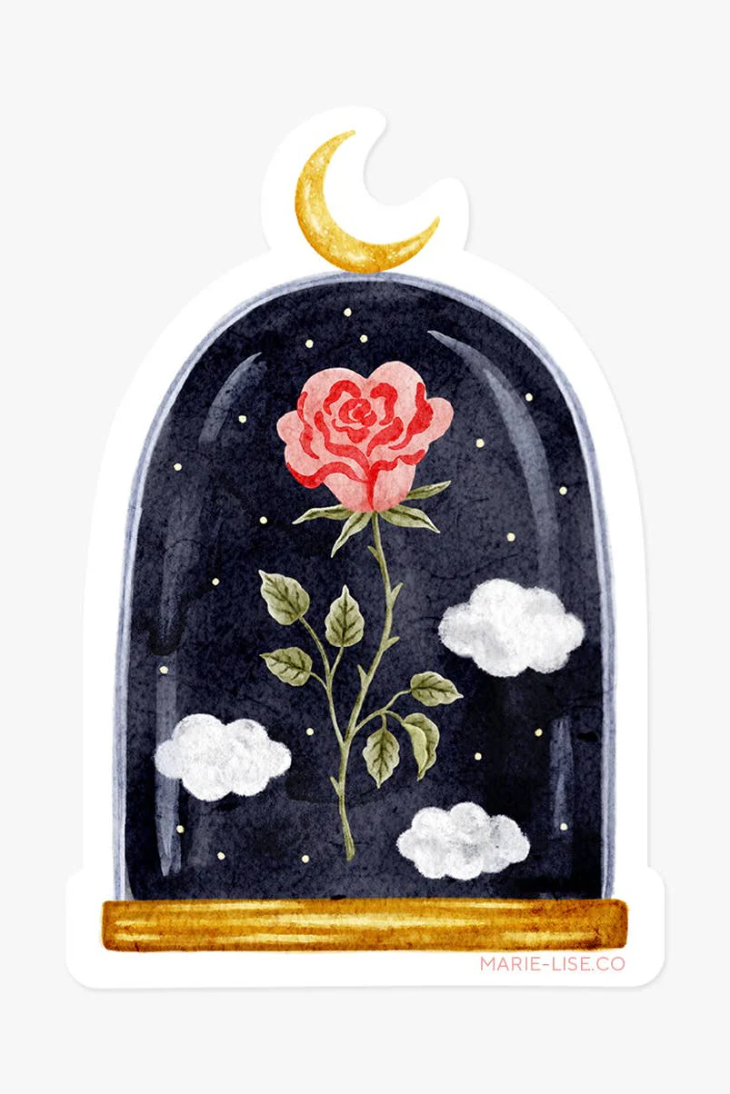 Création locale faite avec amour et talent au Québec. Autocollant découpé. Illustration d’un dôme magique contenant une rose dans un ciel de nuit. Parfait pour décorer et personnaliser vos objets préférés. Environ 2,25 x 3,25 po Impression sur vinyle mat imperméable Résistant au lave-vaisselle Illustré par Marie-Lise