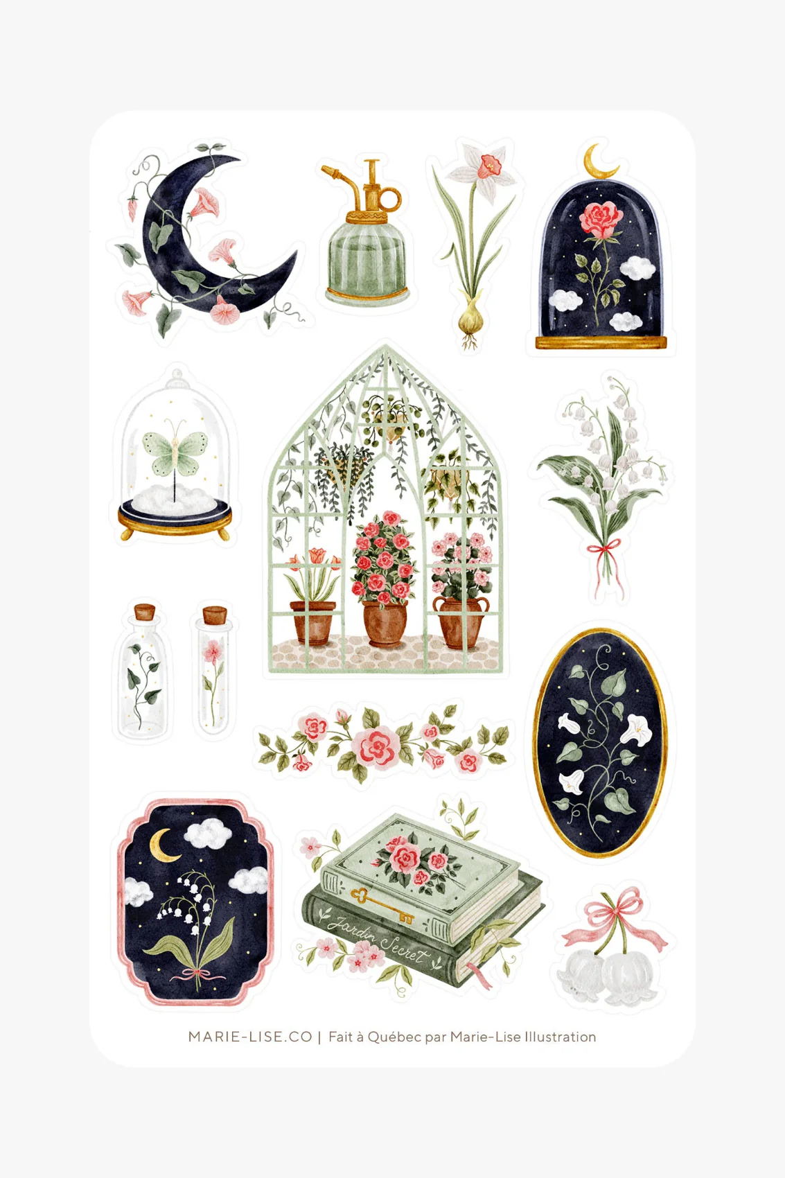 Feuille d’autocollants à thématique jardin secret. Parfaits pour décorer bullet journals, agendas, calendriers, cartes de souhaits, objets de bureau, notes, scrapbooks, etc.