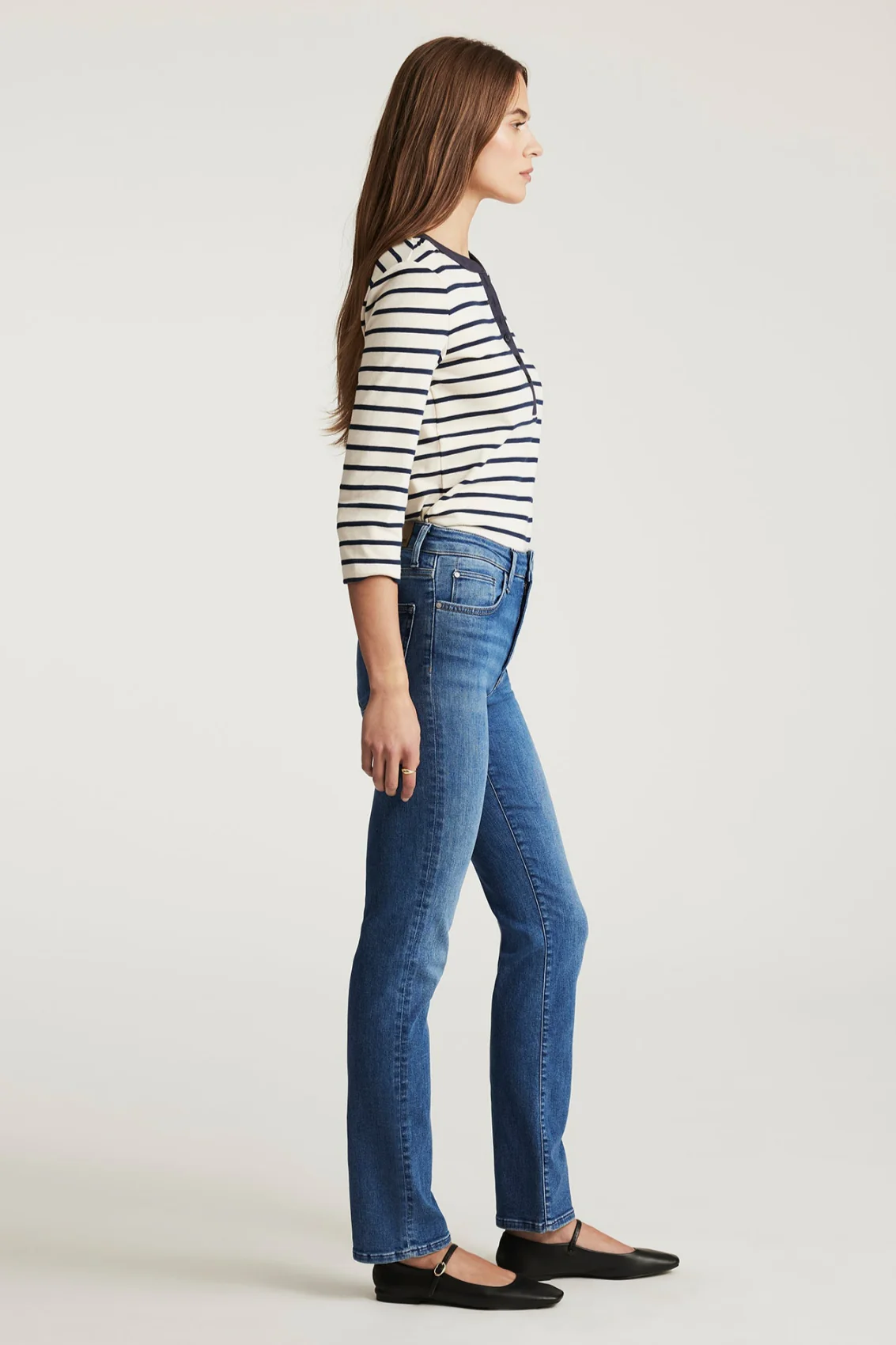 Conçu avec une taille haute classique qui s’ajuste à la taille, le jean Kendra coupe droite est confortable. Sa coupe moderne est ajustée aux hanches et aux cuisses. Ce modèle est proposé dans un délavage bleu moyen classique à moustaches.