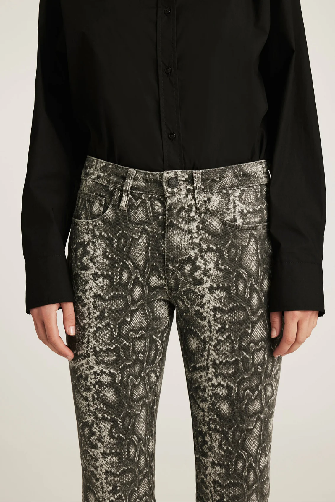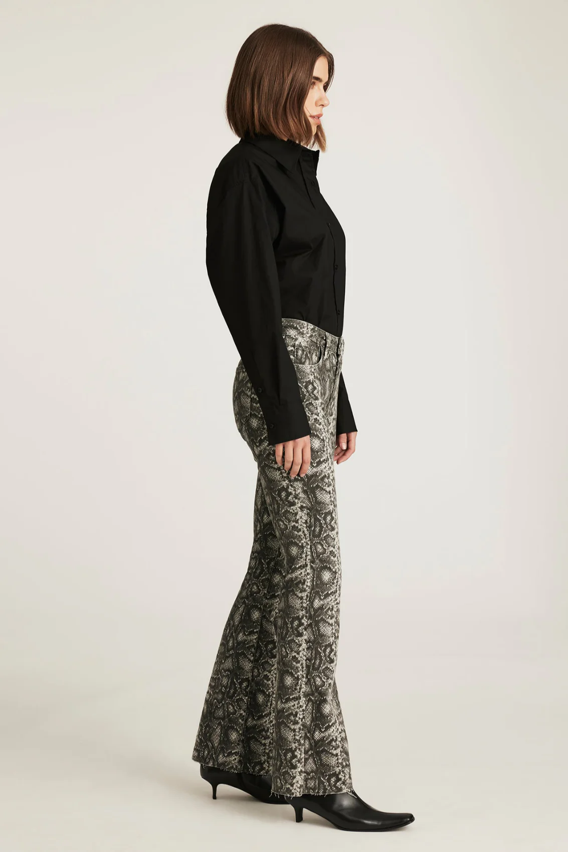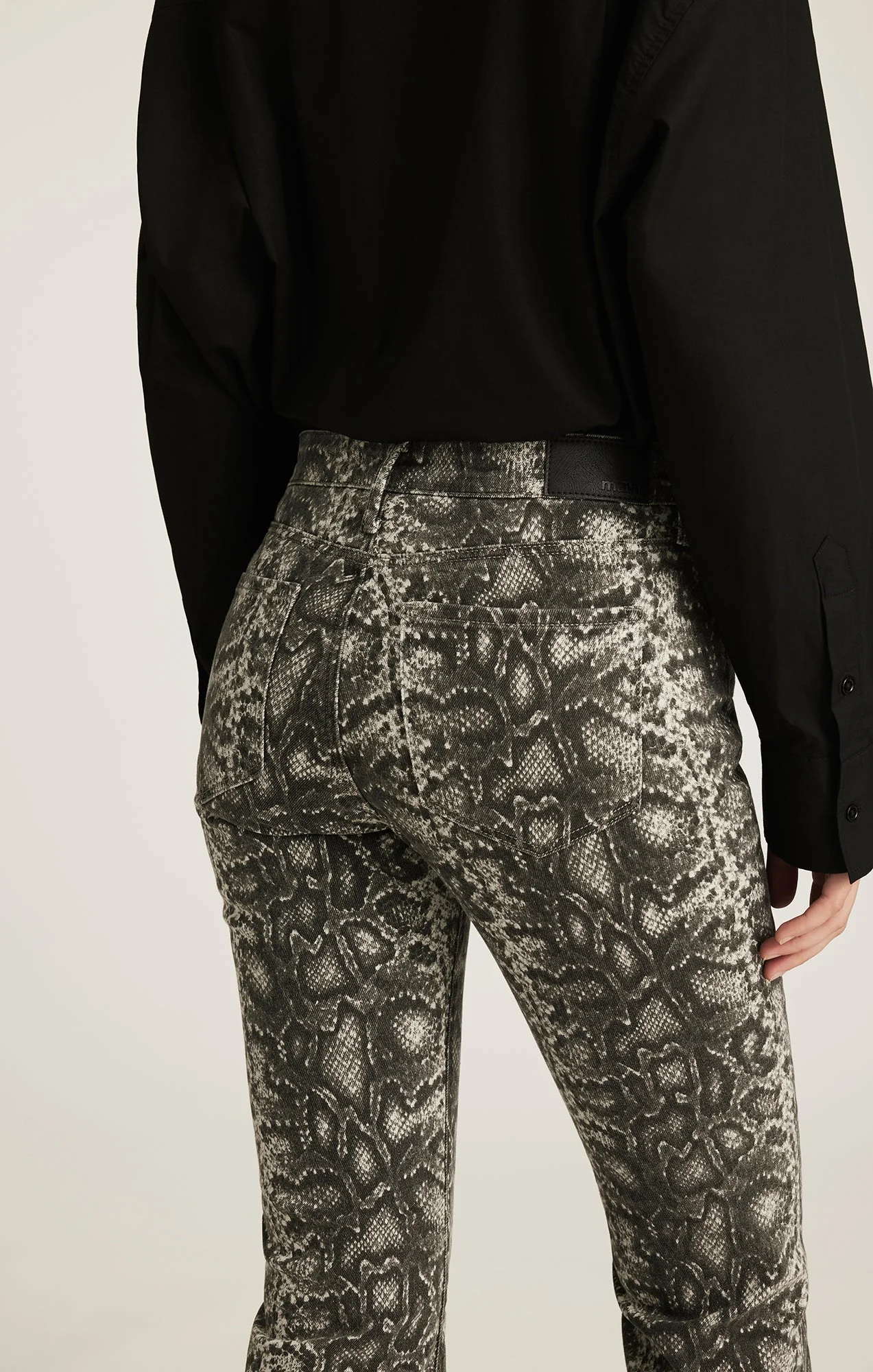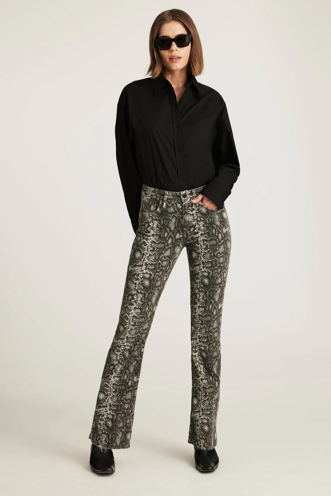 Vicky propose une coupe bootcut plus prononcée avec une coupe évasée qui allonge la jambe. Sa coupe flatteuse et sa taille mi-haute confortable offrent un équilibre parfait entre style et confort. Ce modèle arbore un imprimé serpent classique avec un délavage gris fumé.