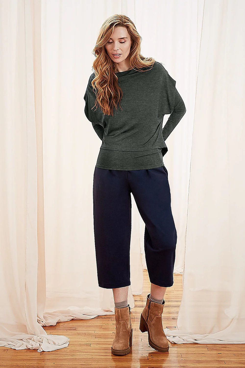 Création locale faite avec amour et talent à Montréal Haut ample avec encolure drapée à deux épaisseurs : la première est ajustée à manches longues et la seconde est ample à manches courte. Composition et entretien Jersey 95% bambou-rayonne 5% spandex Fibres certifiées OEKO-TEX® Laver à la main. Suspendre pour sécher.
