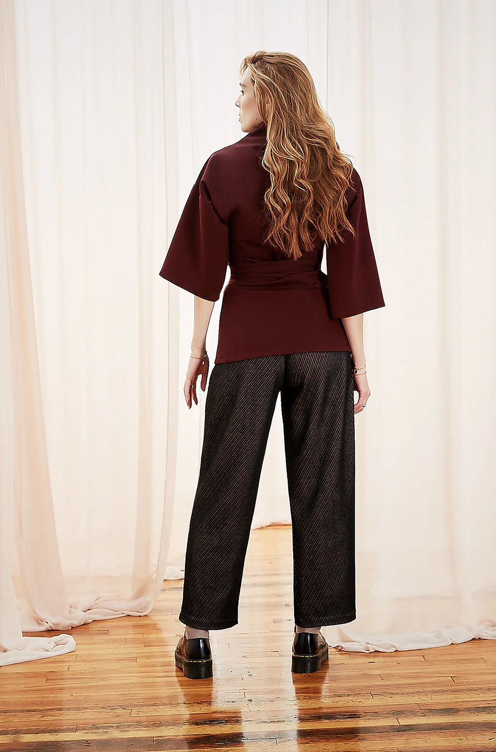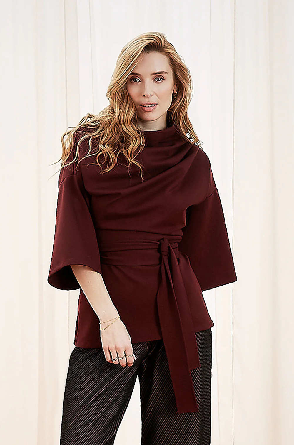 Haut à encolure montante, plissée à l’épaule gauche, manches kimono 3/4 et ceinture écharpe amovible.