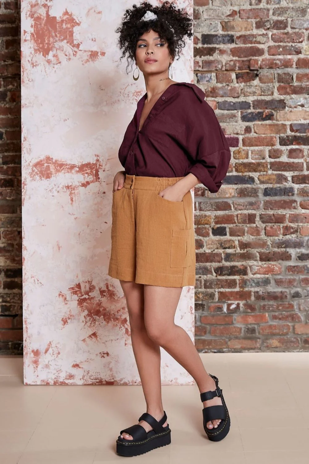 Création locale faite avec amour et talent à Montréal Short cargo avec poches, taille élastique, braguette et fermeture à bouton-pression. Fabriqué à Montréal Composition et entretien 100% Ramie Laver à froid cycle délicat. Suspendre pour sécher.