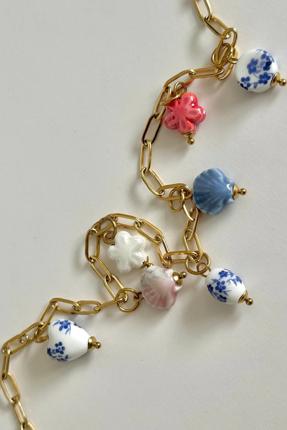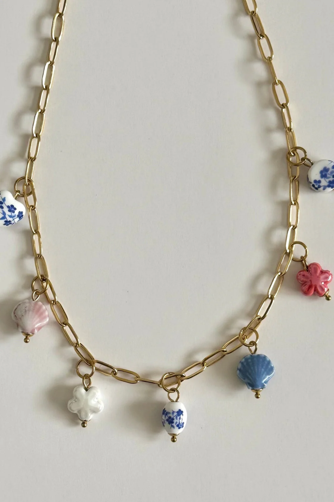 Collier orné de sept charmants pendentifs en céramique, ajoutant une touche de fantaisie et d’élégance à toutes les tenues.